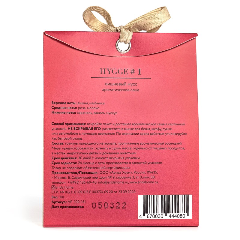 МЫ ПРЕДЛАГАЕМ НОВУЮ ЭКСКЛЮЗИВНУЮ ОПЦИЮ - АРОМАСАШЕ с уникальной коллекцией ароматов HUGGE для дополнительной кастомизации наших рюкзаков. Понятие "Hugge" пришло к нам из Дании и его сложно дословно перевести, но смысл можно передать как "состояние комфорта, уюта, счастья в простых вещах, спокойствия и наслаждения моментом. Добавьте аромасаше коллекции HUGGE пропитанные натуральными ароматическими маслами в наши рюкзаки и неуловимый аромат спокойствия и комфорта будет сопровождать вас целый день окутывая ваши вещи и нейтрализуя неприятные запахи. Модели рюкзаков, в которых есть специальные карманы для аромасаше отмечены на нашем сайте специальным значком AROMA UNI. Вы также можете использовать аромасаше коллекции HUGGE для ароматизации шкафов, одежды, белья, автомобилей. Всегда приятно возвращаться в чистый, красиво пахнущий дом или садиться в автомобиль наполненный роскошным ароматом. НОТЫ АРОМАТА: Верхние ноты: вишня, клубника Средние ноты: роза, молоко Нижние ноты: карамель, ваниль, мускус СПОСОБ ПРИМЕНЕНИЯ: Вскройте пакет и достаньте ароматическое саше в картонной упаковке. НЕ ВСКРЫВАЯ САШЕ, разместите в ящике для белья, шкафу, сумке или автомобиле с помощью держателя. По окончании срока действия утилизируйте как бытовой отход. Меры предосторожности: хранить в сухом месте, отдельно от пищевых продуктов, в местах недоступных детям и домашним животным. СОСТАВ: Гранулы природного материала, пропитанные ароматической эссенцией СРОК ДЕЙСТВИЯ: 30 дней с момента вскрытия упаковки СРОК ГОДНОСТИ: 24 месяца с даты производства в закрытой упаковке Товар не подлежит обязательной сертификации.