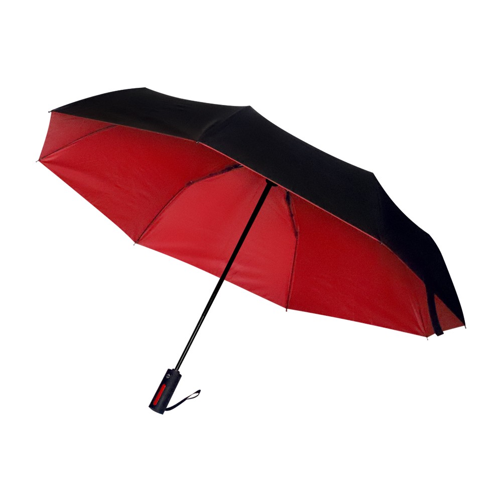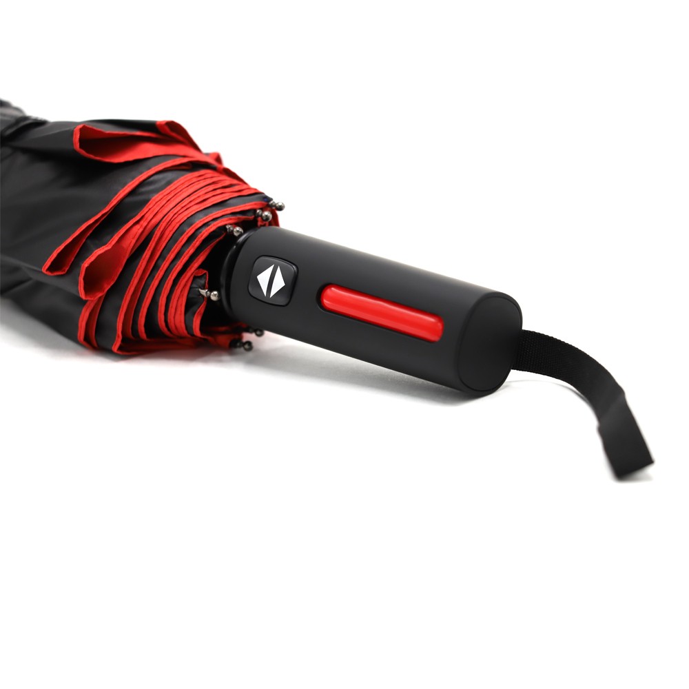 Автоматический противоштормовой складной зонт Sherp. Материал купола – эпонж. На таком материале вода превращается в капельки и скатывается, а сам зонт остается сухим. Цветной элемент на ручке – в тон купола. Ветрозащитная функция – спицы из стекловолокна, а специальное устройство препятствует поломке спиц при резких порывах ветра.