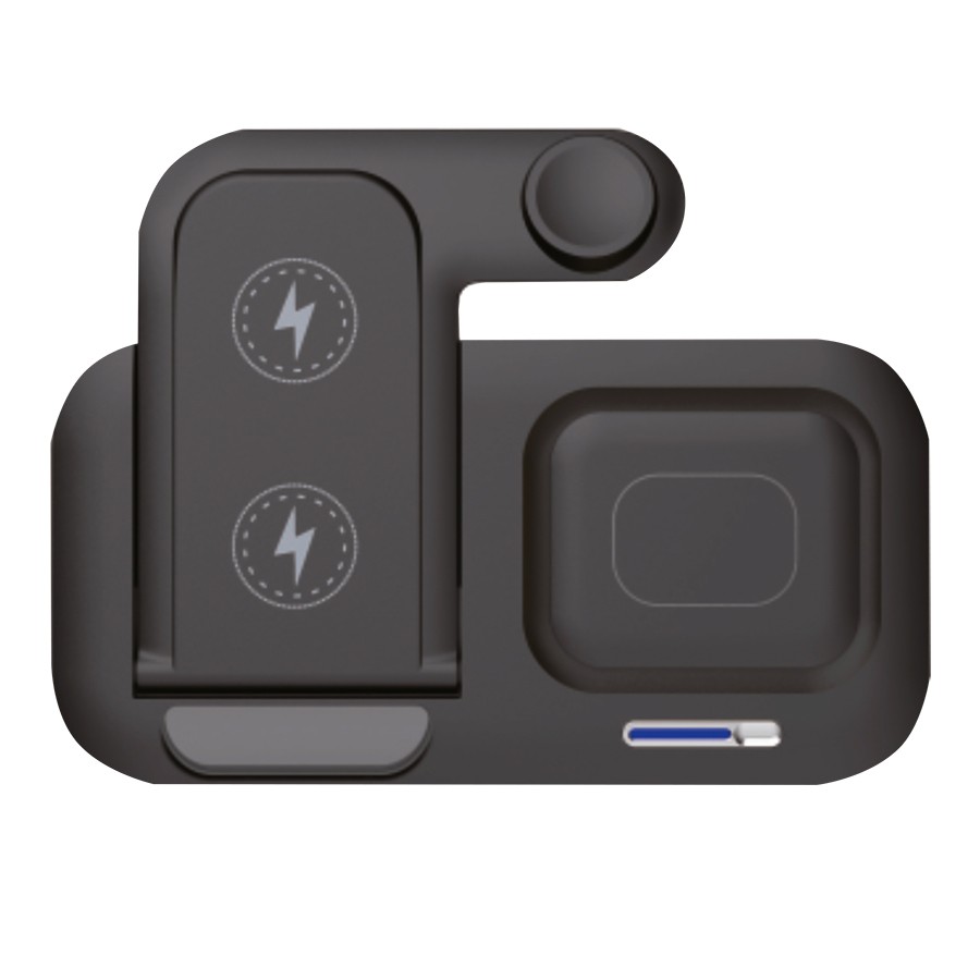 Беспроводная зарядная станция 5в1 мощностью 15 Вт представляет собой многофункциональное устройство, идеальное для зарядки различных гаджетов одновременно. Среди ее особенностей: 1. Зарядка для телефона: стандартная функция зарядки для смартфонов с функцией беспроводной подзарядки Android/Ios. 2. Зарядка для наушников: специальное отделение для беспроводной зарядки наушников с поддержкой технологии Qi. 3. Зарядка для часов: возможность зарядки только умных часов Apple Watch 4. Подставка для телефона: удобная подставка, обеспечивающая устойчивую поддержку смартфона в вертикальном положении во время зарядки. 5. Подсветка для наушников: интегрированный элемент освещения, который помогает легко найти наушники, когда они находятся в зарядной станции. Эта беспроводная зарядная станция предлагает удобство, эффективность и стиль в одном устройстве, идеально подходящем для использования в офисе, дома или на рабочем месте. Для работы беспроводной зарядки необходимо подключать устройство к сети через адаптер. Type - C используется для подключения устройства к сети, USB выход - для зарядки иных устройств.