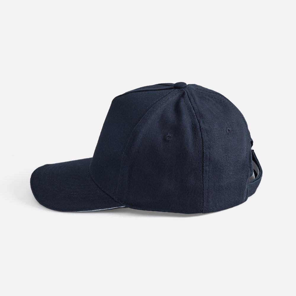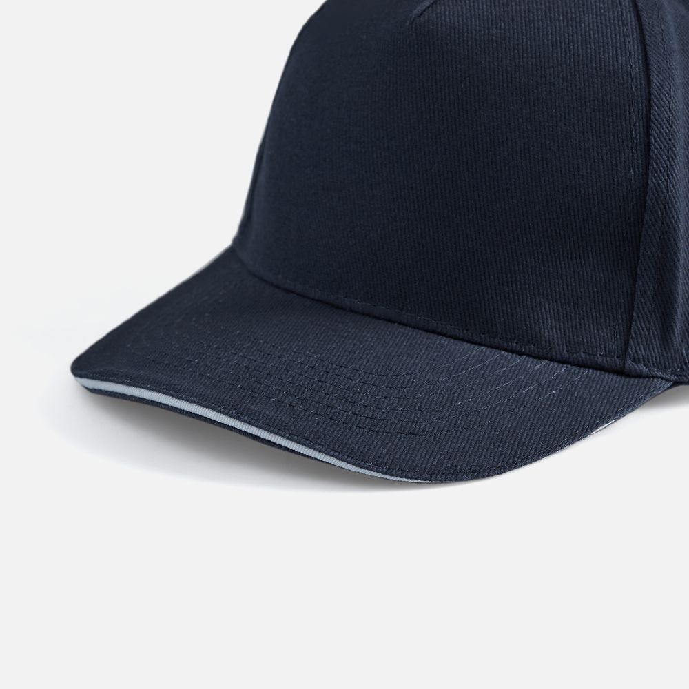 Модель бейсболки с 5-ю клиньями без лобового шва из плотного чесаного хлопка.