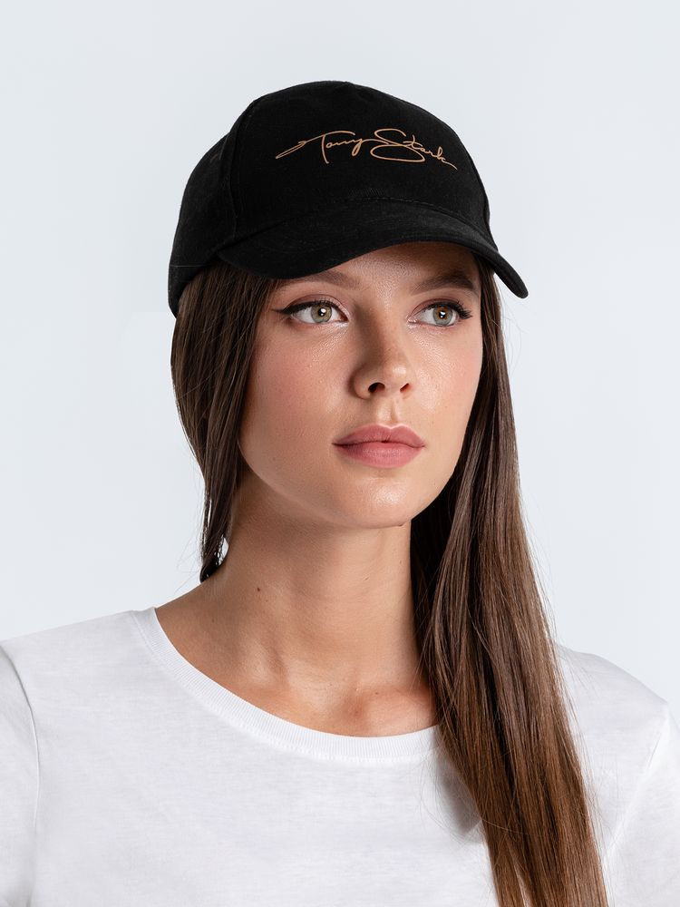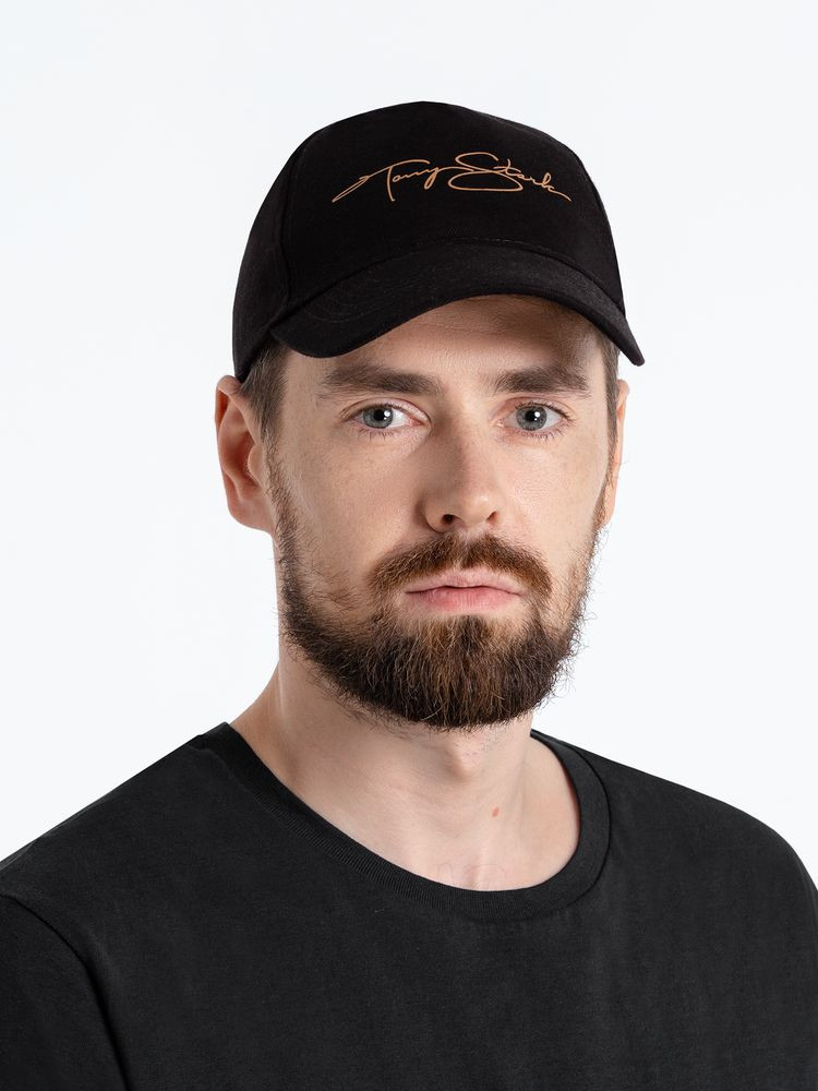 Черная классическая бейсболка с его бронзовой подписью добавит образу небрежный шик.