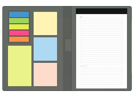 Блокнот со стикерами выполнен из искусственной кожи в твердой обложке. Материал рельефный, приятный на ощупь, напоминает джинсу. Внутри вы найдете: блокнот из 70 страниц, стикеры, а также петлю для ручки. Стикеры выполнены в 3-х размерах: 3 квадратных разноцветных набора (размер: 55х55 мм), 1 набор прямоугольных (размер: 55х95 мм) и набор из 5 разноцветных закладок. Блокнот надежно закрывается на магнитную застежку.