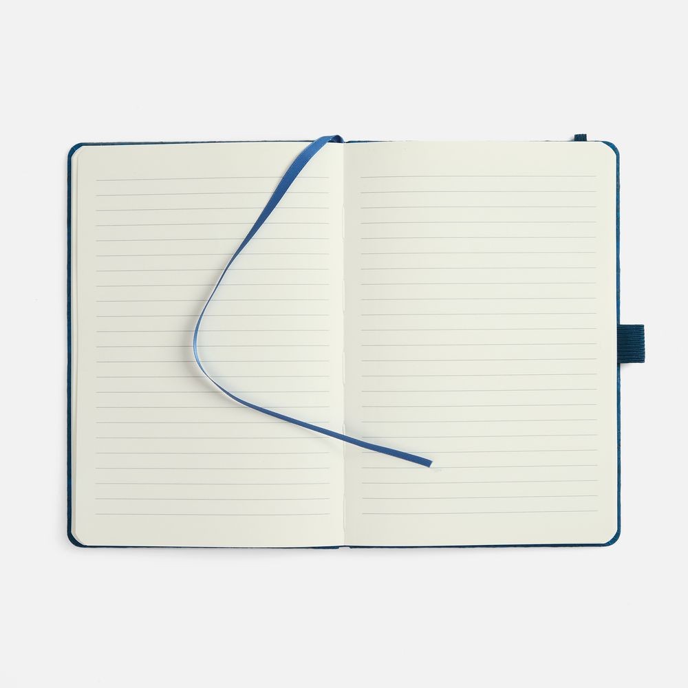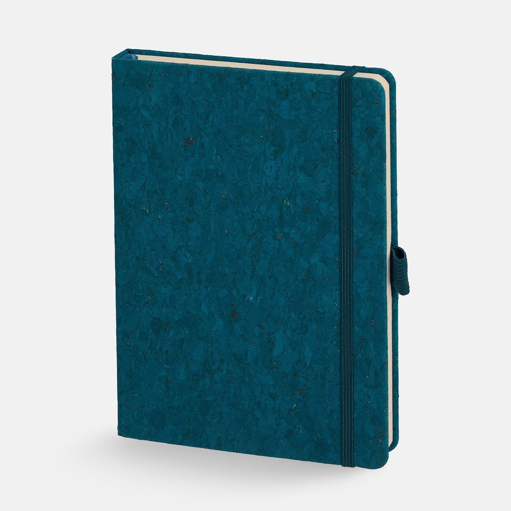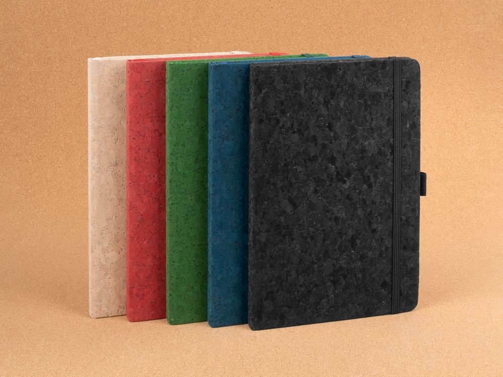 Блокнот с твердой обложкой из натуральной окрашенной пробки, дополнен петлей-резинкой для ручки, ляссе и резинкой в цвет обложки.