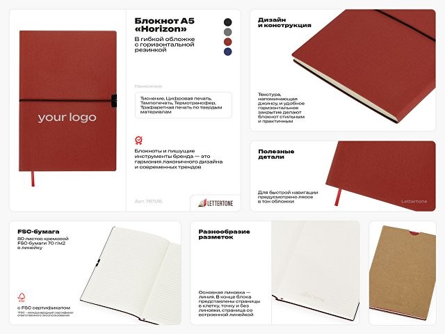 Horizon от Lettertone — блокнот с удобной гибкой обложкой, закрывающейся на горизонтальную резинку. Обложка имеет текстуру, напоминающую джинсу. Бумажный блок выполнен из бумаги, полученной из древесины из специальных восполняемых лесных ресурсов, имеет сертификат FSC, международной некоммерческой организации лесного попечительского совета. Линовка — линия, последние страницы блока — 5 страниц в точку, 5 страниц в клетку, 5 страниц без линовки, одна страница имеет срез-линейку 20 см. Упаковка — шубер из крафта. - 80 листов - гибкая обложка обеспечивает легкость конструкции блокнота - бумага из восполняемых лесных ресурсов - ляссе в тон обложки для быстрой навигации