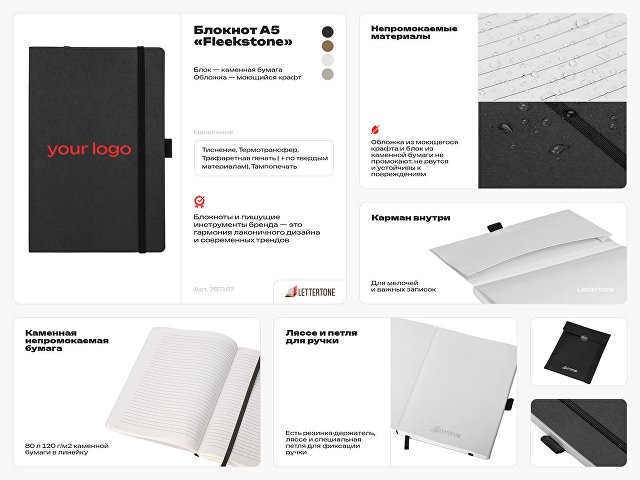 Fleekstone от Lettertone — блокнот в гибкой обложке из непромокаемого моющегося крафта. Блок выполнен из каменной бумаги, добываемой из переработанного камня, имеет повышенную прочность и гладкость, не промокает и практически не рвется. Дополняет эффект натуральности и непромокаемости обложка из моющегося крафта - экологичная и такая же непромокаемая, как блок. Линовка — линия, последние страницы блока — 4 страницы в точку, 4 страницы в клетку, 4 страницы без линовки, одна страница имеет срез-линейку 20 см. Также блокнот снабжен резинкой и петлей для ручки. Упаковка — конверт из нетканого материала с логотипом. - 80 листов - не промокает - каменная бумага повышенной прочности и гладкости - ляссе в тон обложки для быстрой навигации