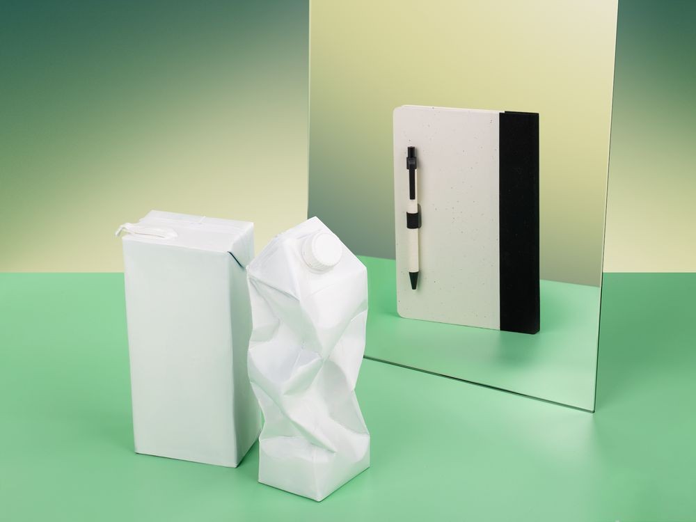 Бумага и обложка произведены из переработанных пакетов из-под молока. Обложка из картона плотностью 140 г/м² .