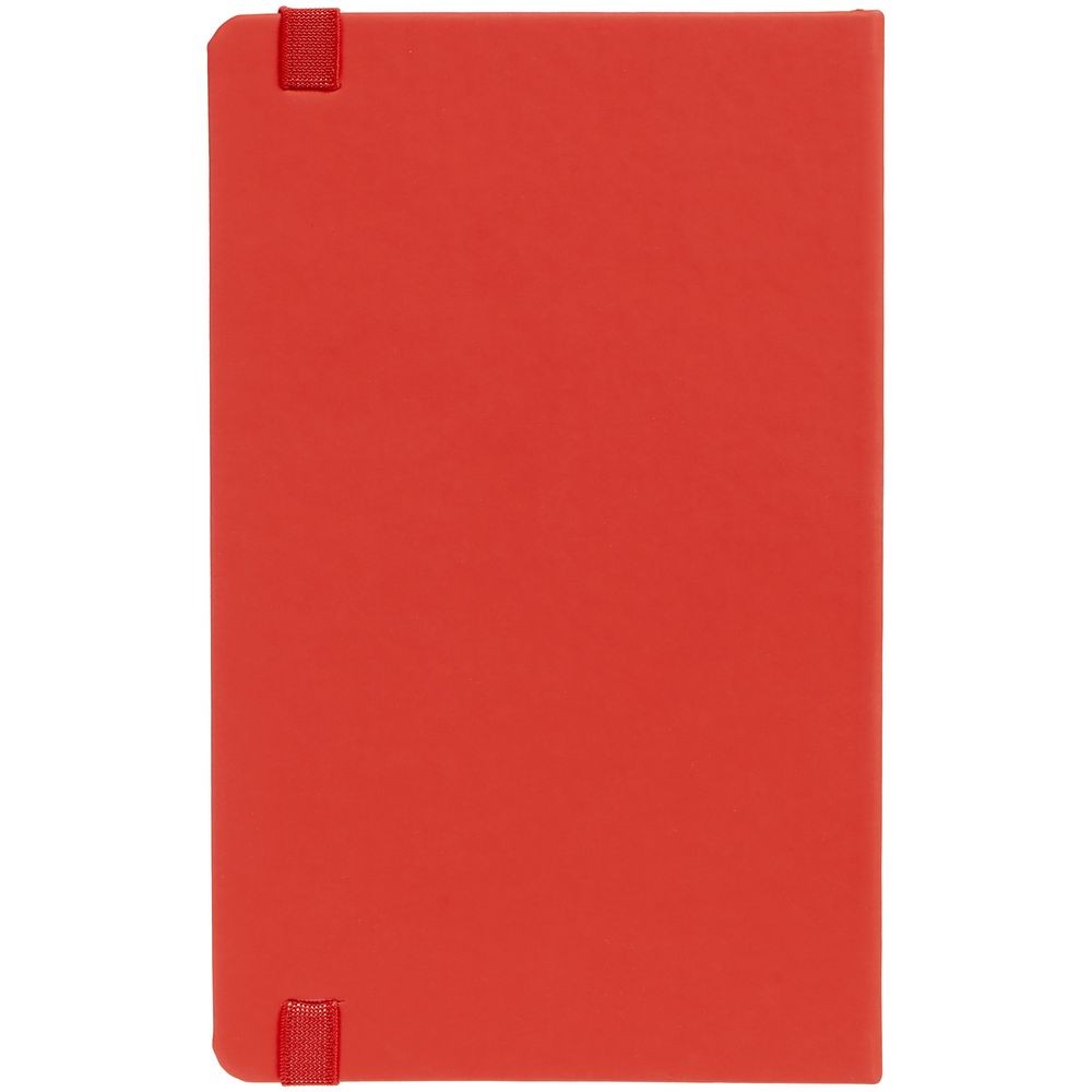 Блокнот в твердой обложке, выполнен из материала Soft Touch Ultra, красный РР, дополнен резинкой и ляссе в цвет обложки.