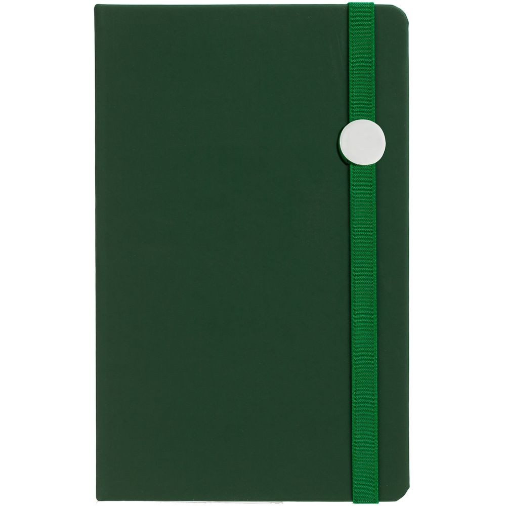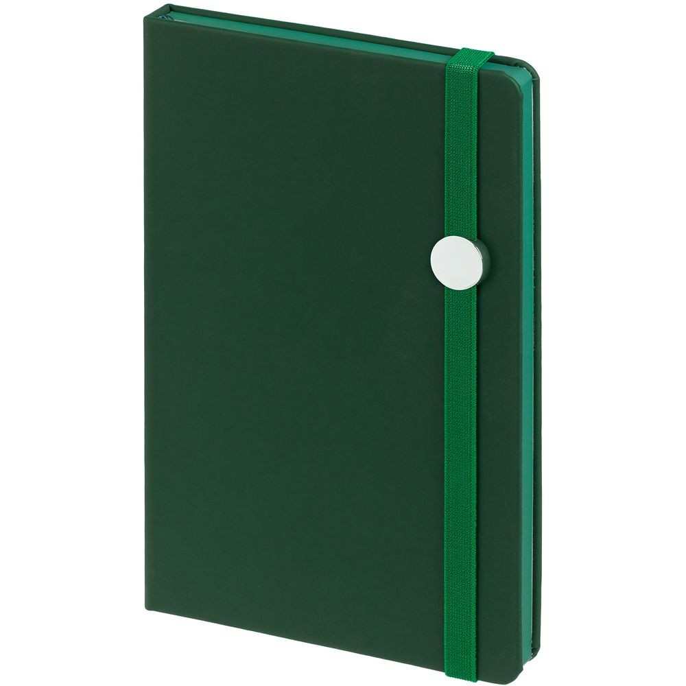 Блокнот в твердой обложке, выполнен из материала Soft Touch, зеленый FF, дополнен резинкой и ляссе в цвет обложки.