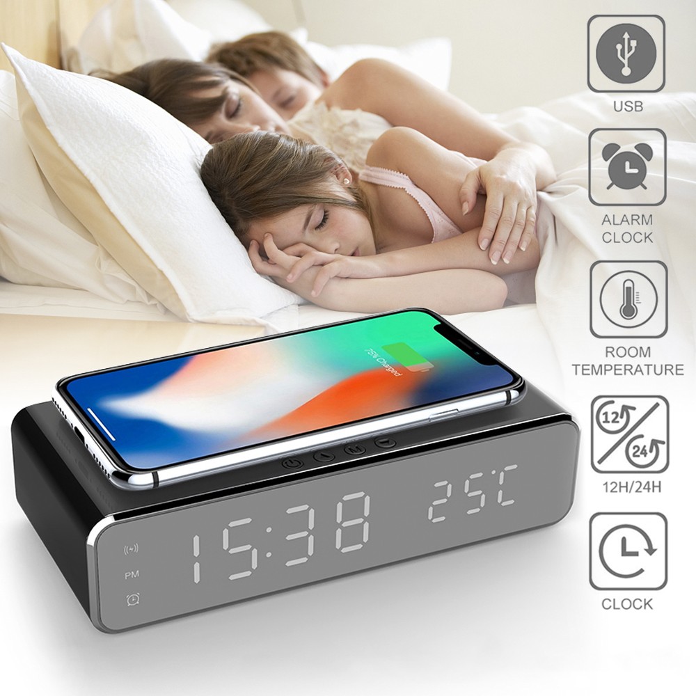 Часы имеют простой и элегантный дизайн с LED дисплеем, на котором отображается комнатная температура. Устройство позволяет устанавливать три разных времени будильника для вашего удобства. Наверху часов расположен модуль для беспроводной зарядки с мощностью 5 Вт, что позволяет быстро и удобно заряжать ваш смартфон. Размеры упаковки часов составляют 17.4 x 10.4 x 5 см.