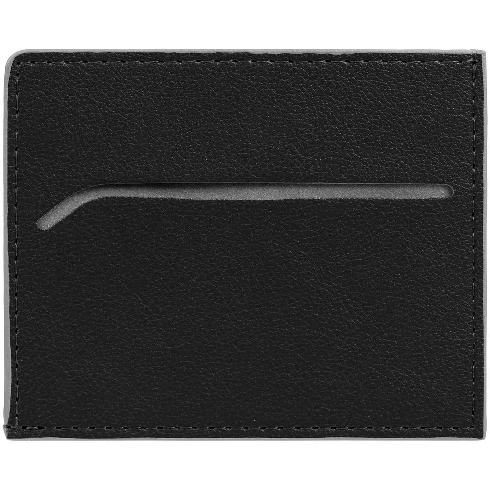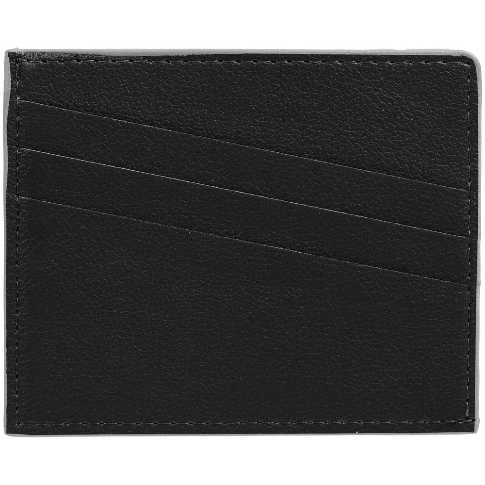 Чехол выполнен из материала Petrus, черный АА, дополнен окрашенным срезом края и внутренним карманом из серого картона. Имеет 4 отделения для кредитных карт и 1 отделение для купюр.