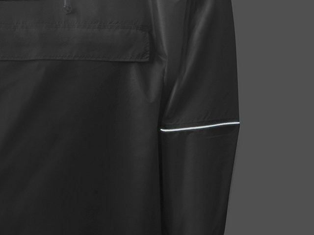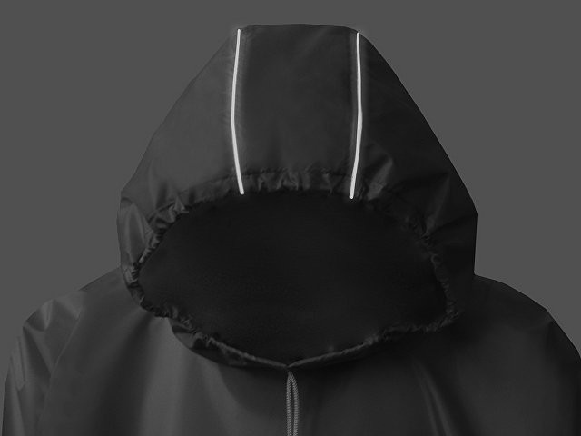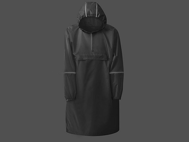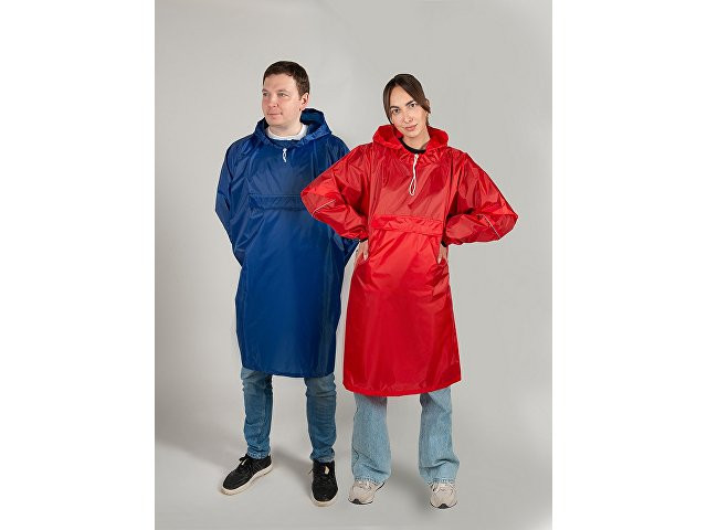Дождевик - пончо прямого силуэта. Нагрудный карман плаща закрывается на молнию, которая дополнительно защищена клапаном, а еще в него можно полностью убрать дождевик. На дне кармана — ручка-петелька, которая в сложенном виде может использоваться для подвешивания. Швы капюшона и рукавов отделаны светоотражающим кантом, который делает человека заметным даже в темное время суток. Для комфортной посадки — затягивающийся на шнурок капюшон с фиксатором и манжеты на резинке.