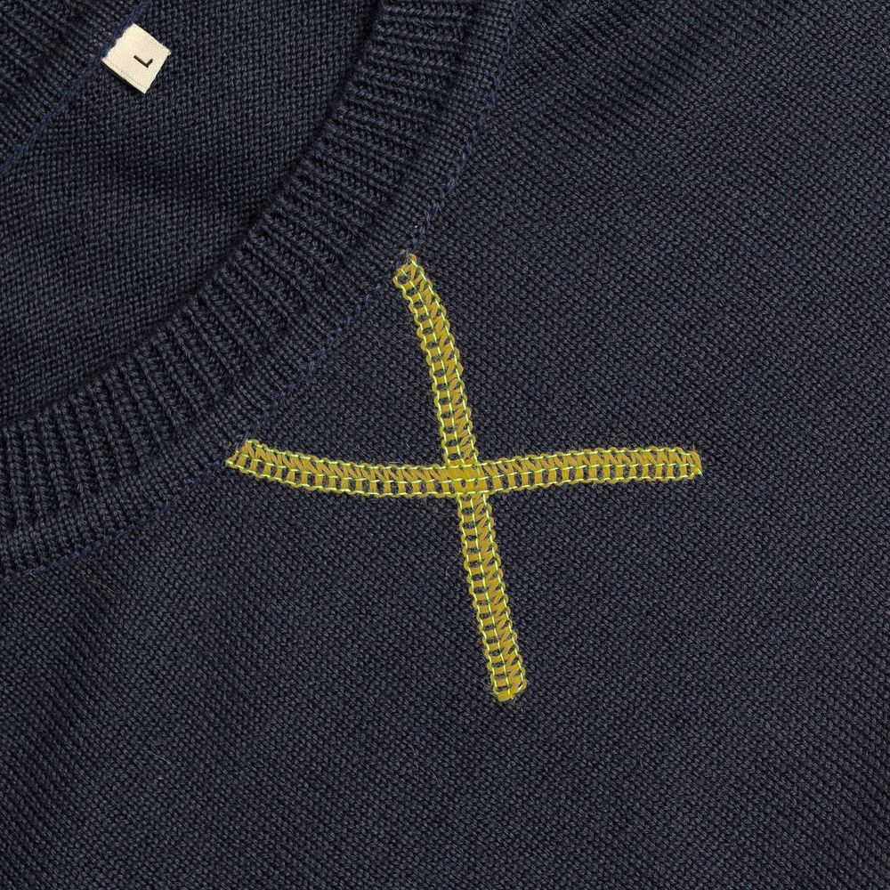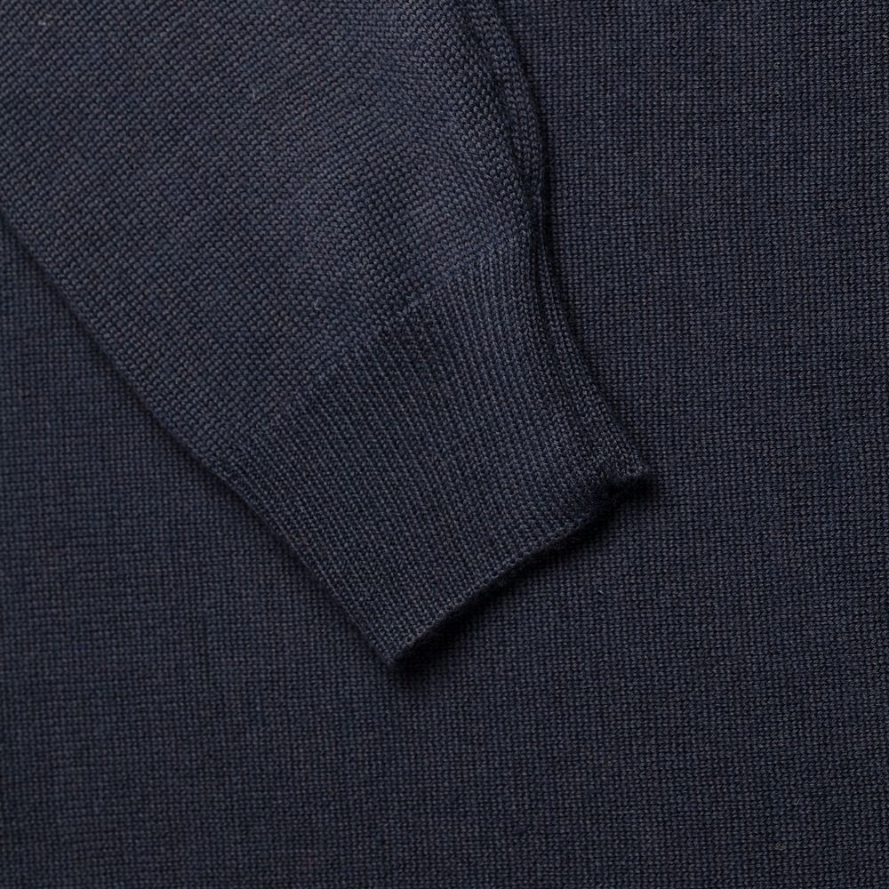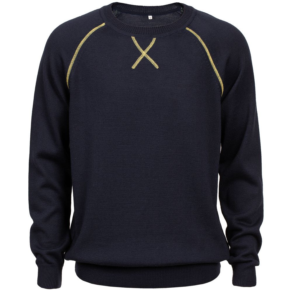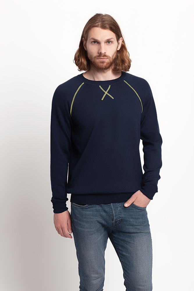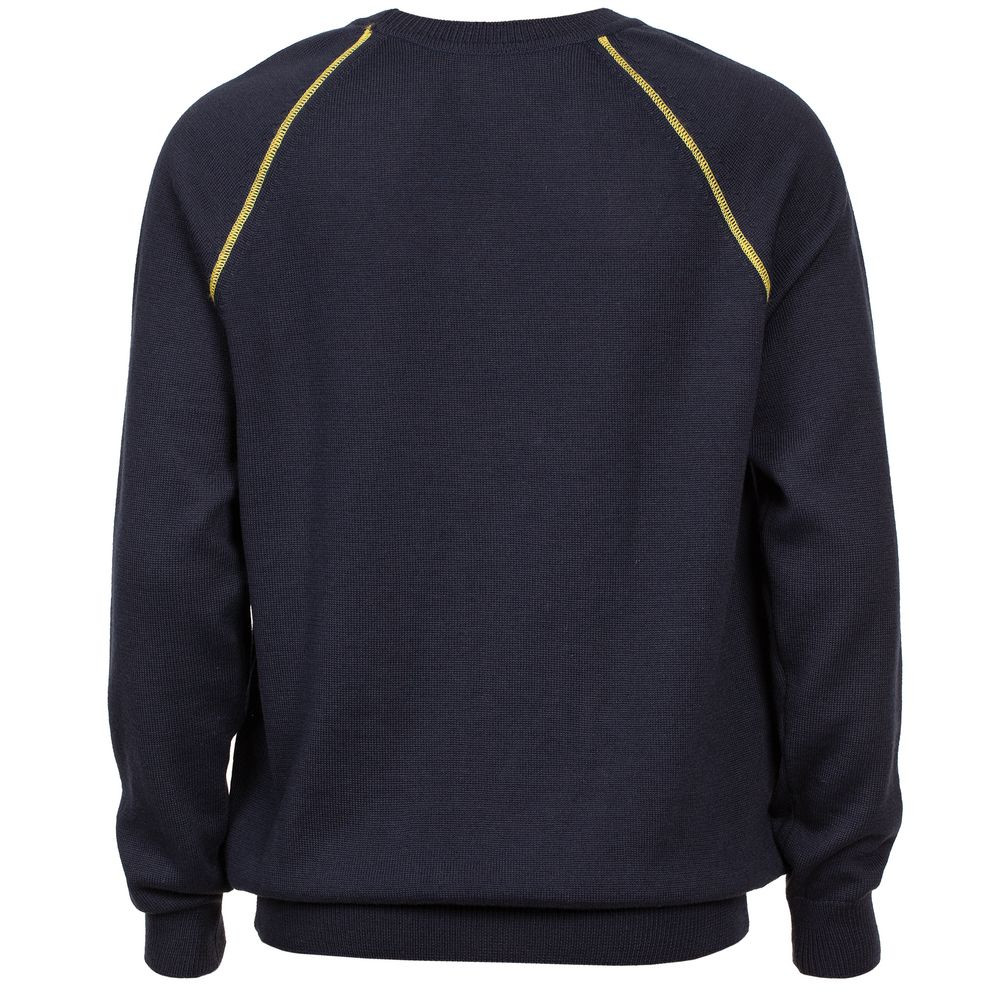 Джемпер чулочной вязки с круглым воротом и контрастной строчкой.