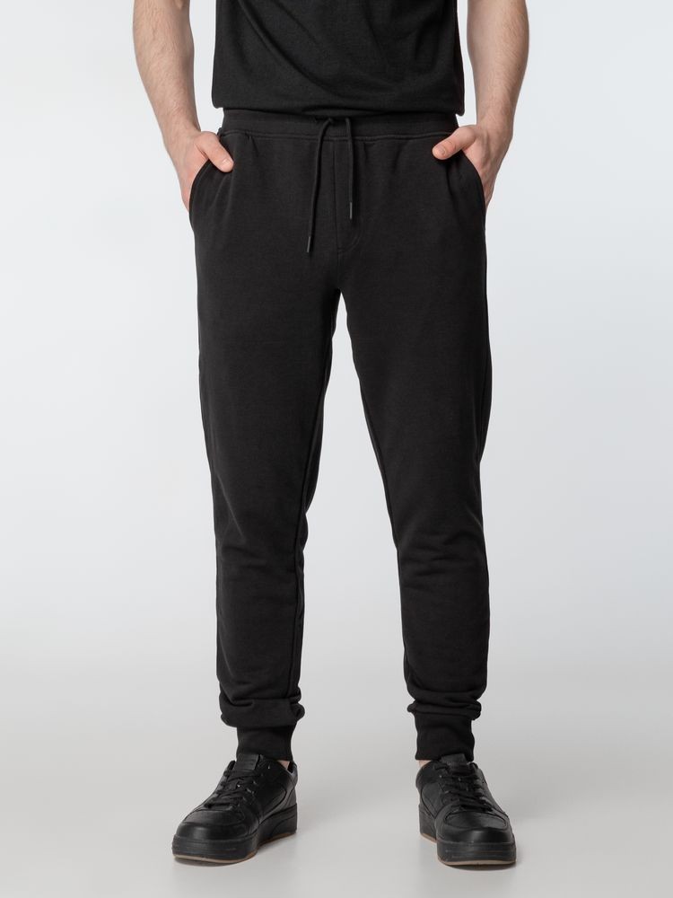 Мужские спортивные брюки-джоггеры из органического хлопка и переработанного полиэстера. Два боковых кармана, задний накладной карман. Эластичный пояс с утягивающим шнуром. Манжеты по низу изделия. Внутренняя сторона без начеса.