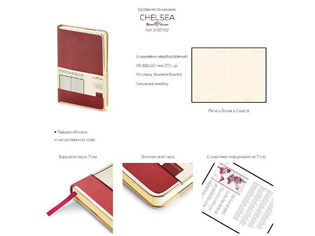 Недатированный ежедневник «Chelsea» от бренда Bruno Visconti - это качественный корпоративный подарок по выгодной цене, произведенный специально под персонализацию. Представлен в универсальном формате А5. Деловой аксессуар, напоминающий об эпохе расцвета Голливуда, в элегантной неповторимой манере преподносит привычные классические формы. Твердая обложка оформлена металлическим кантом по всему периметру. С ним хорошо сочетается металлизированный обрез. В ежедневнике «Chelsea» есть полезная справочная информация и телефонная книга, а также 272 страницы для записи идей, мыслей и составления рабочих планов. Есть закладка - тесьма из шелка, она интегрирована в обложку и может использоваться как хлястик. Для изготовления страниц используется качественный бежевый офсет повышенной плотности (70 г/кв м), которая производится в Японии и подходит для всех видов чернил. Бордовое ляссе, совпадающее по цвету с капталом, служит для удобного перехода к текущей дате. Все ежедневники от бренда Bruno Visconti можно персонализировать с помощью тиснения обложки - золотой или серебрянной фольгой. Наши ежедневники помогут быть успешным и эффективным в карьере и повседневной жизни!