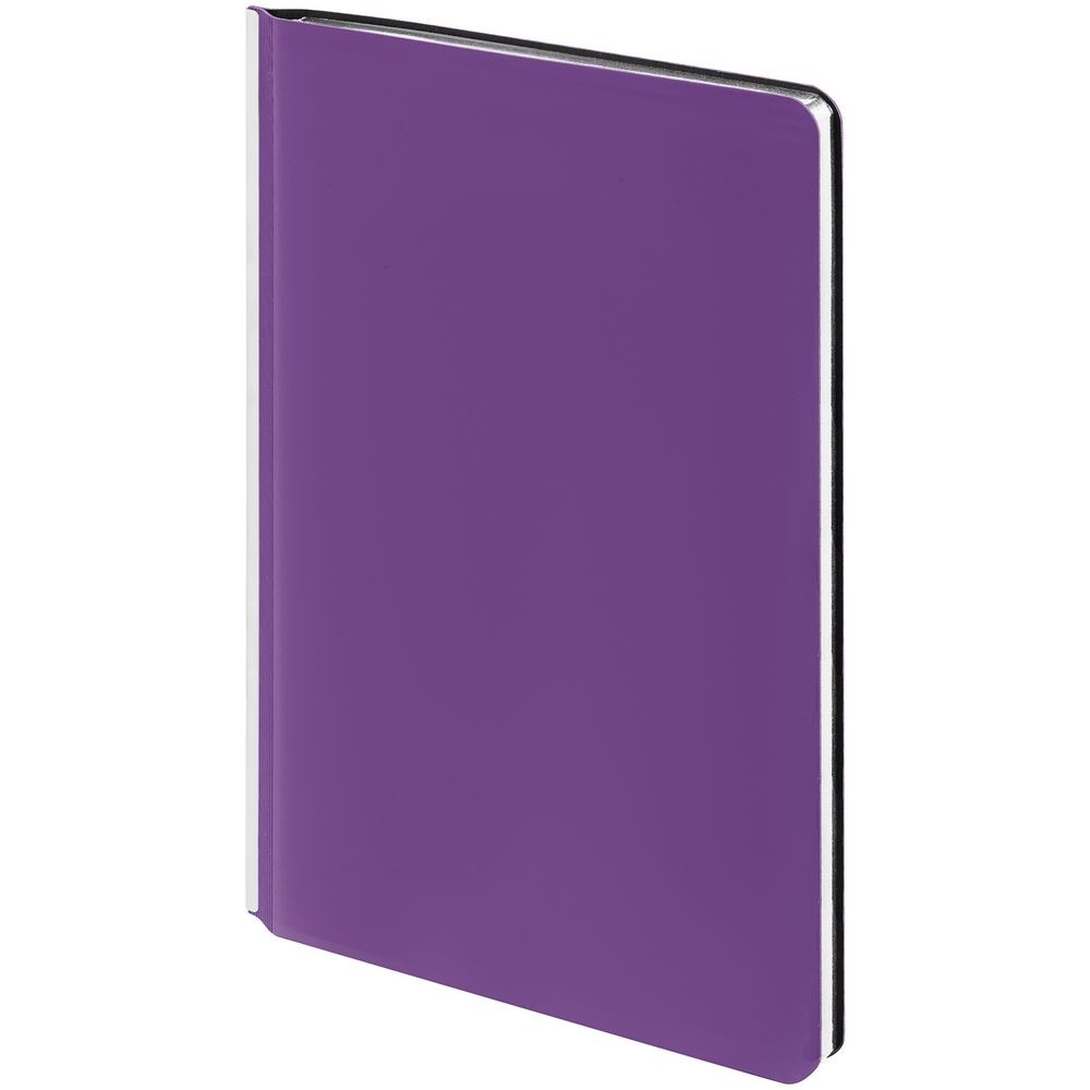 Ежедневник с гибкой обложкой и металлическим корешком, выполнен из материала Soft Touch, фиолетовый UU, дополнен серебристым обрезом блока и ляссе.