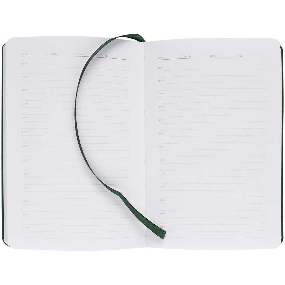 Ежедневник с твердой обложкой, выполнен из материала Latte, зеленый FF, дополнен ляссе в цвет обложки.