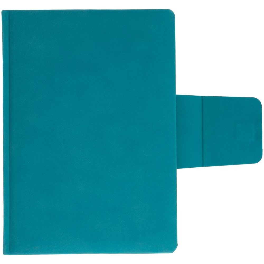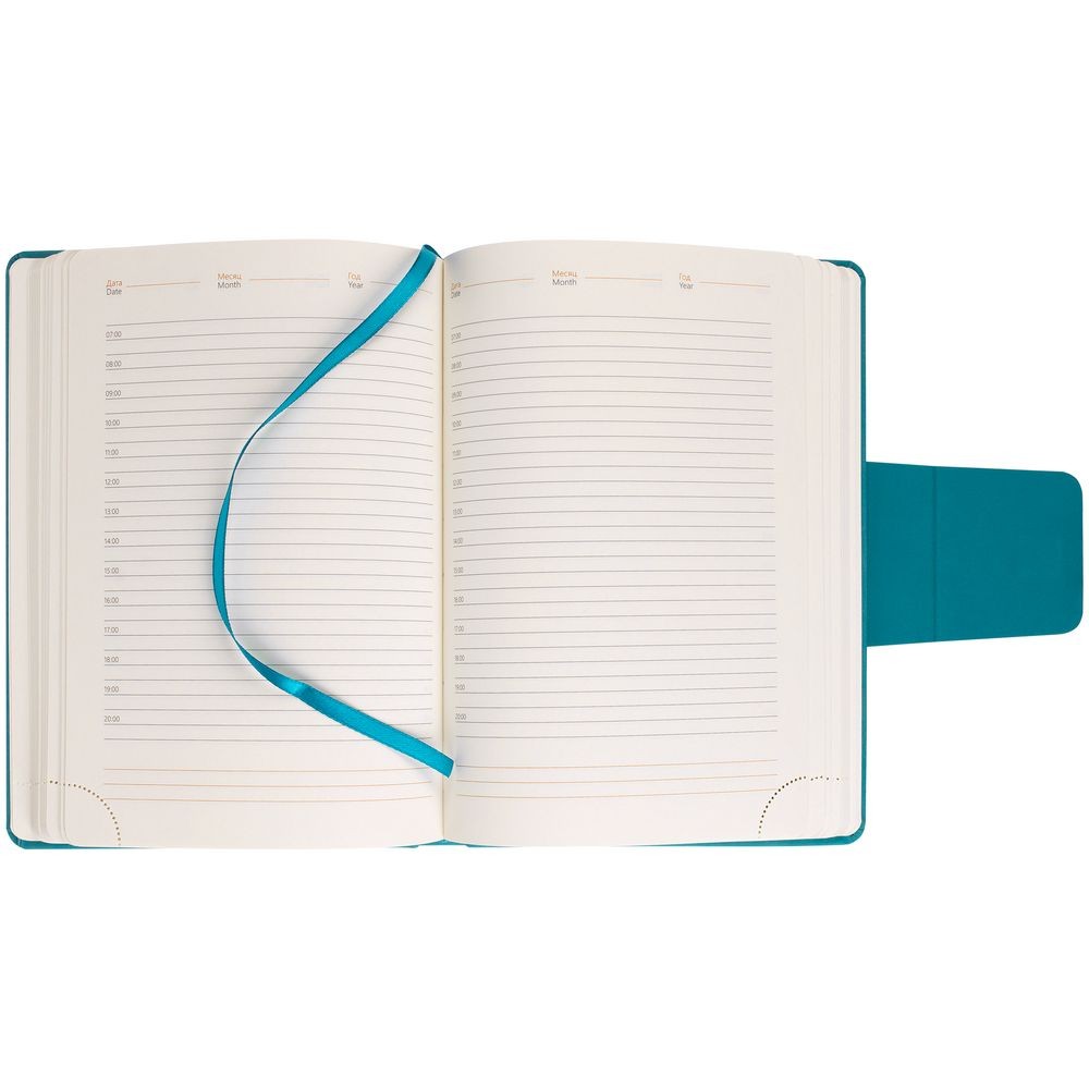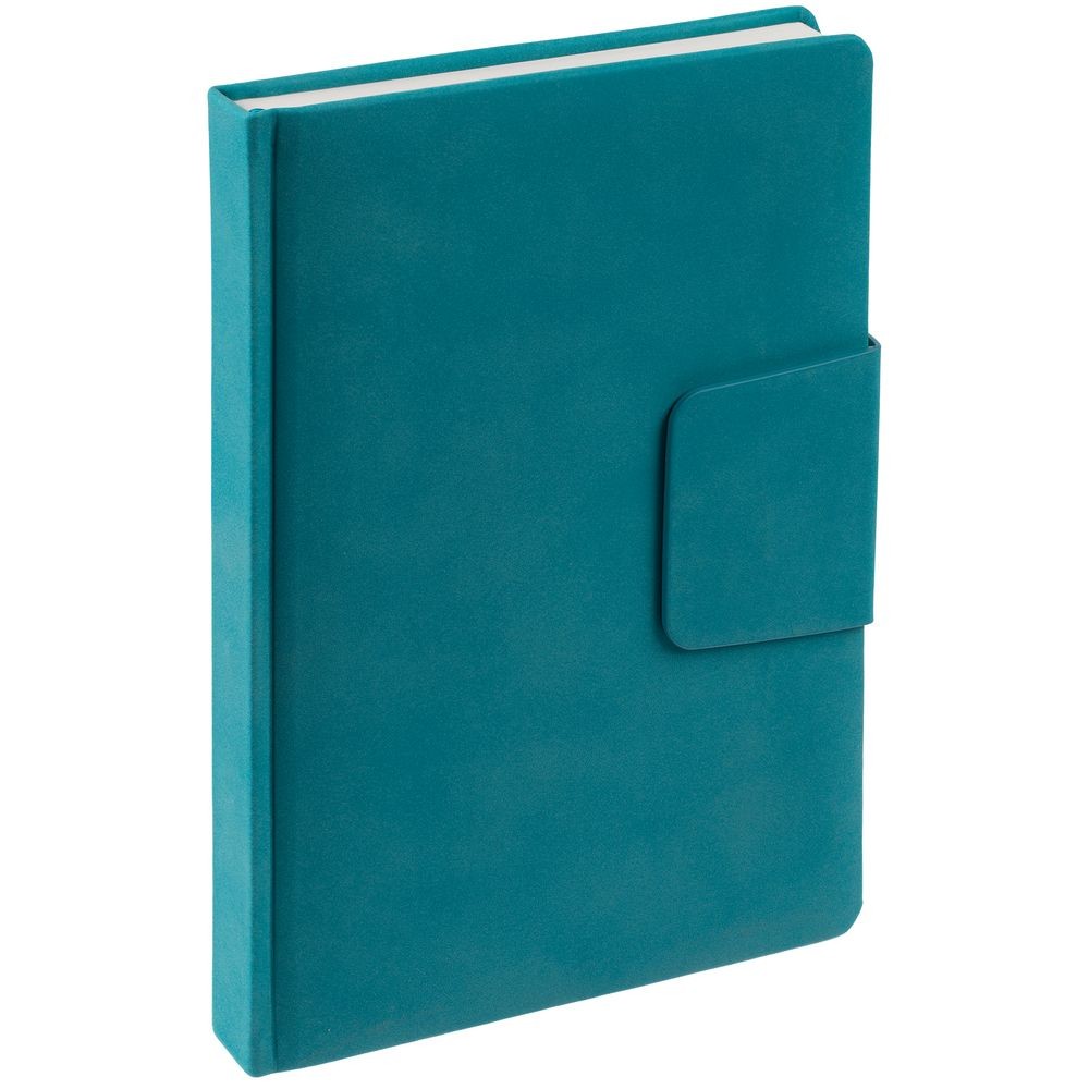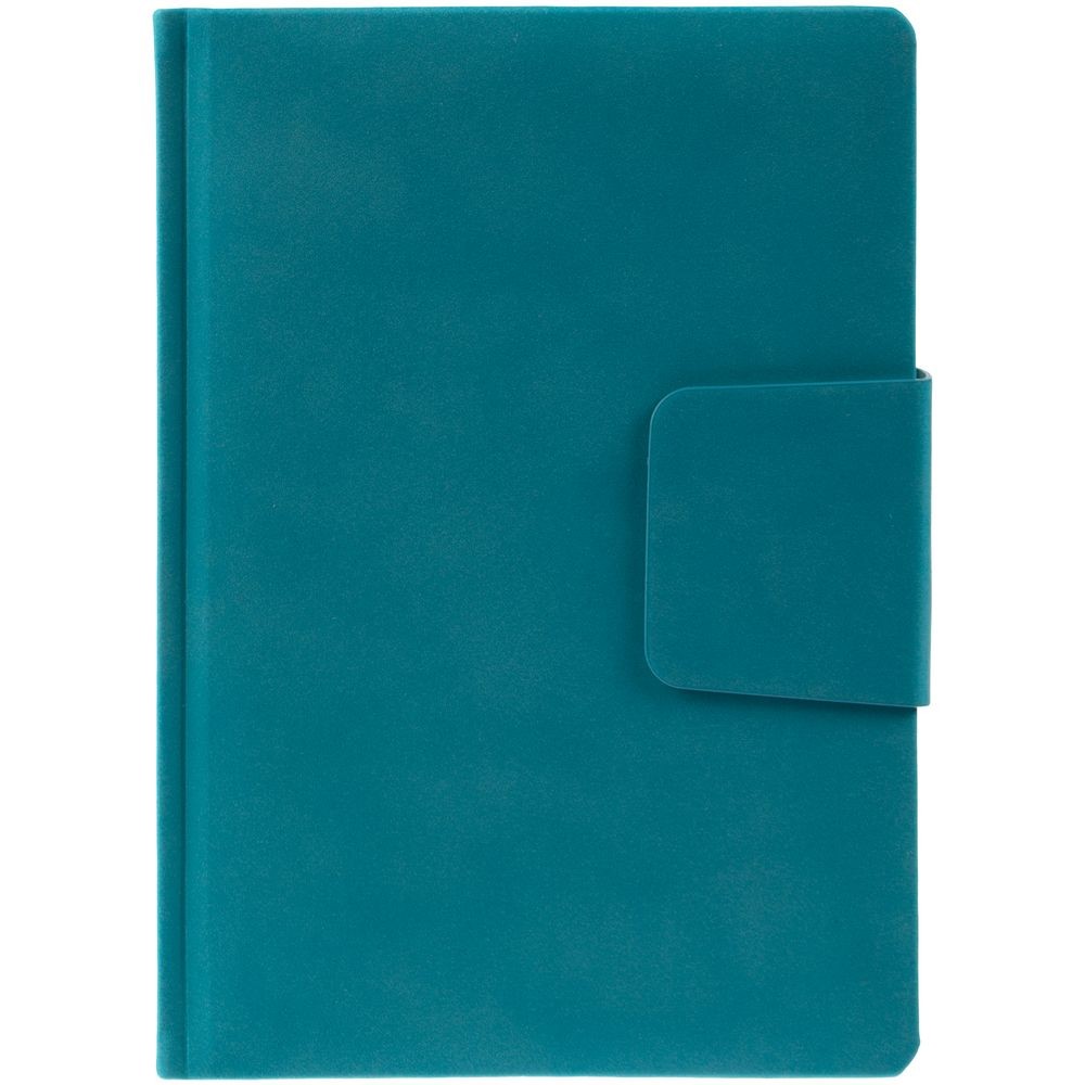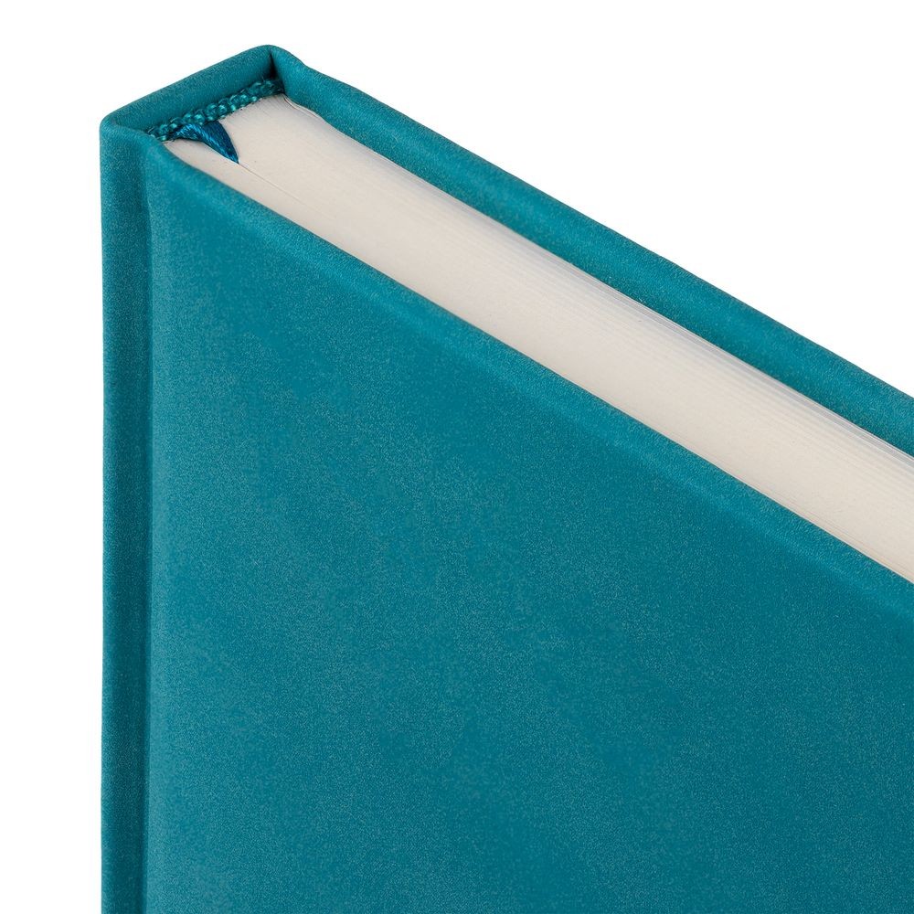 Ежедневник с твердой обложкой c поролоном, выполнен из материала Nubuck, морской волны, дополнен капталом и ляссе бирюзового цвета. Застежка — хлястик на магните.