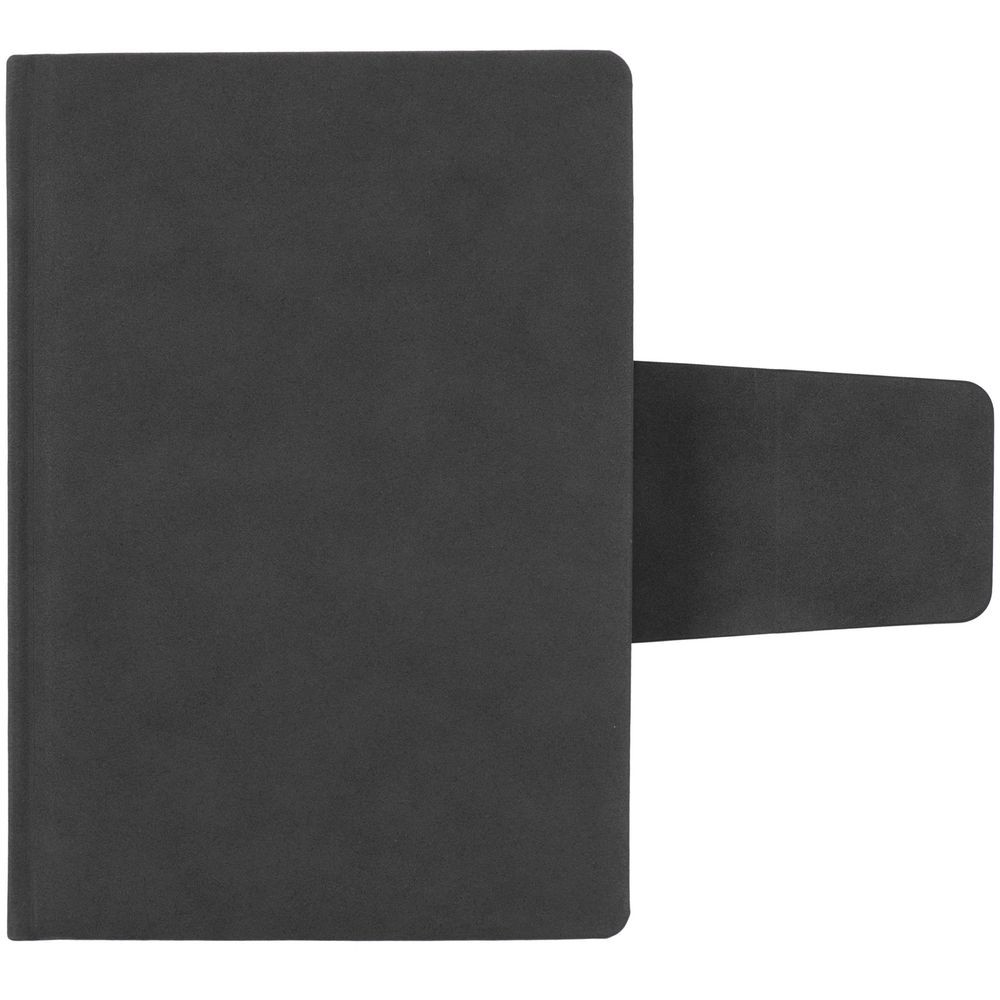Ежедневник с твердой обложкой c поролоном, выполнен из материала Nubuck, темно-серый ЕЕ, дополнен капталом и ляссе черного цвета. Застежка — магнитный хлястик.