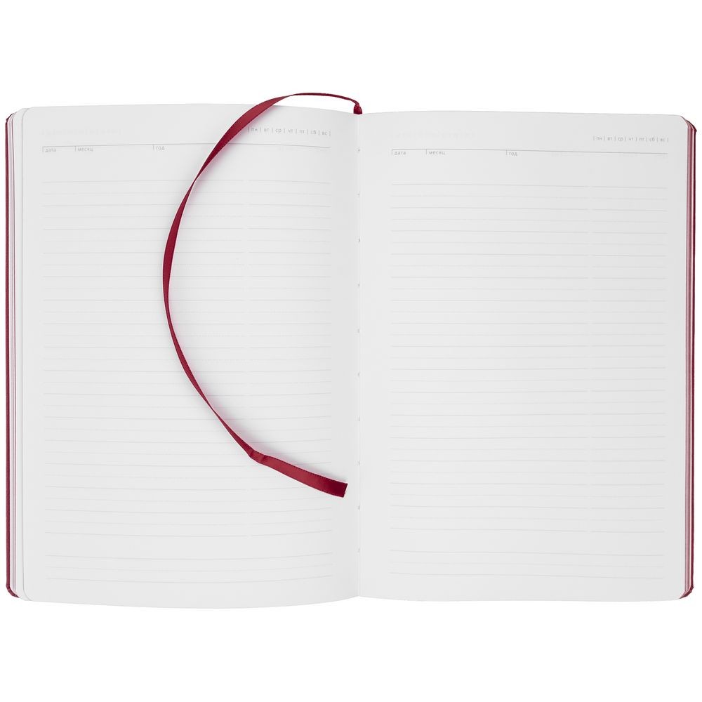 Ежедневник с твердой обложкой и тонированным обрезом. Выполнен из материала Latte, бордовый, дополнен ляссе в цвет обложки.