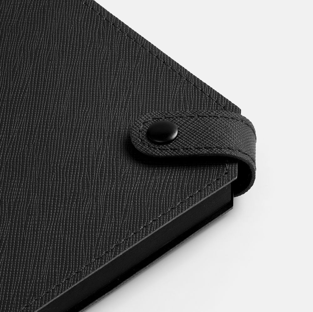 Ежедневник с гибкой обложкой, выполнен из материала Espresso, дополнен ляссе черного цвета и хлястиком на кнопке.