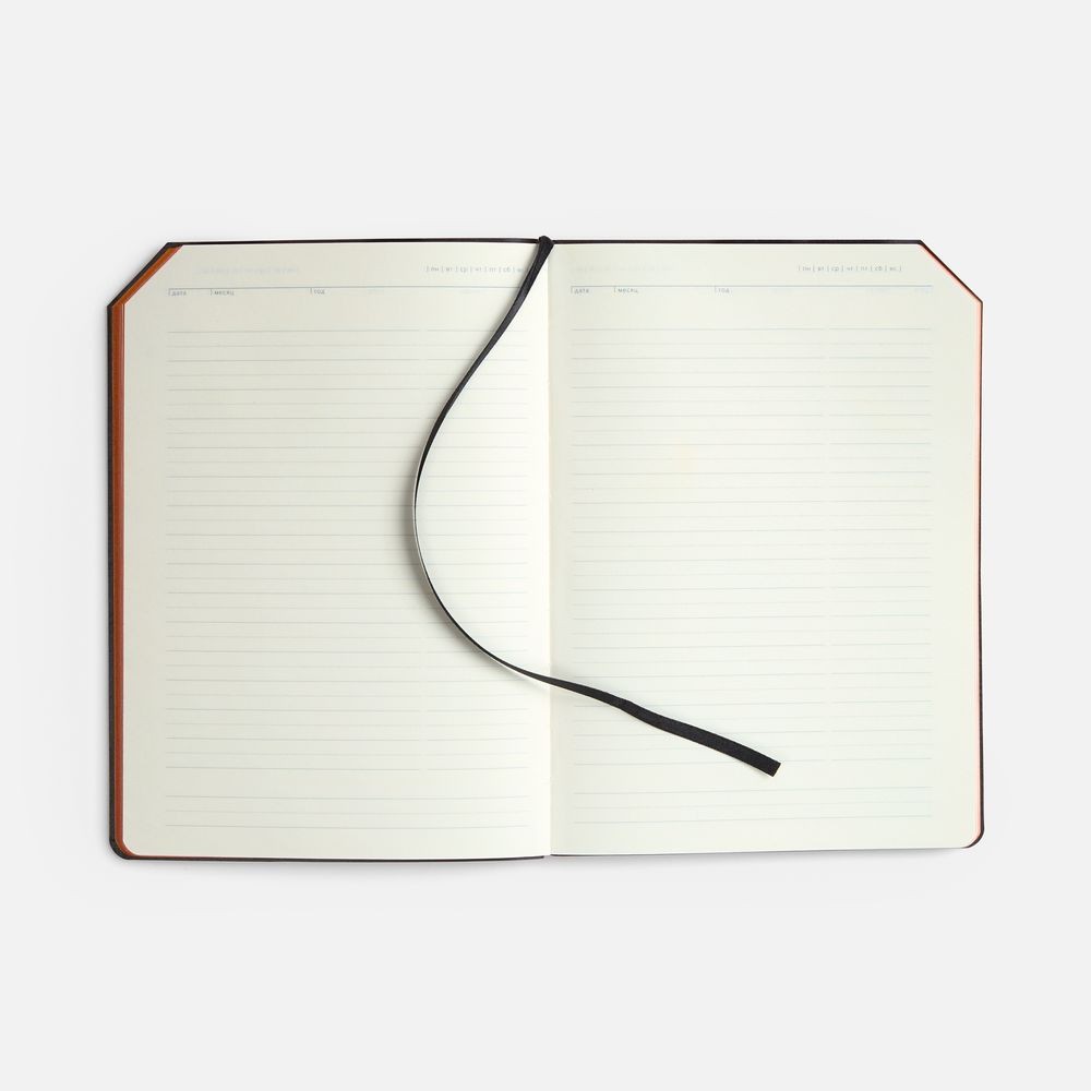 Ежедневник с гибкой обложкой, выполнен из материала Espresso, дополнен ляссе черного цвета и хлястиком на кнопке.