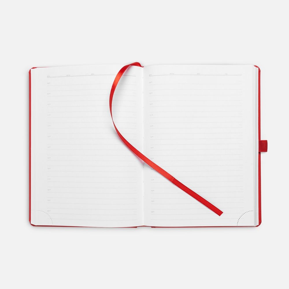 Ежедневник с твердой обложкой без поролона, выполнен из материала Soft Touch Ultra, красный РР, дополнен резинкой шириной 1 см, петлей-резинкой для ручки, капталом и ляссе красного цвета.