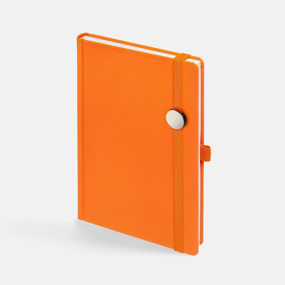 Ежедневник с твердой обложкой без поролона, выполнен из материала Soft Touch, оранжевый ОО, дополнен резинкой шириной 1 см, петлей-резинкой для ручки, капталом и ляссе оранжевого цвета.