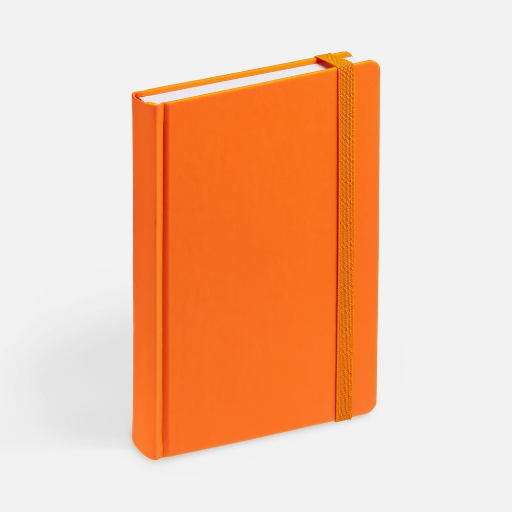 Ежедневник с твердой обложкой без поролона, выполнен из материала Soft Touch, оранжевый ОО, дополнен резинкой шириной 1 см, петлей-резинкой для ручки, капталом и ляссе оранжевого цвета.