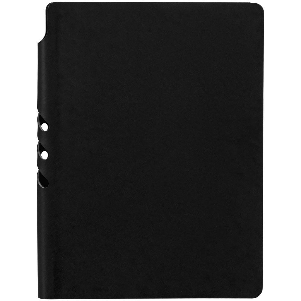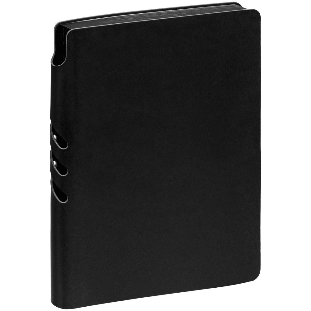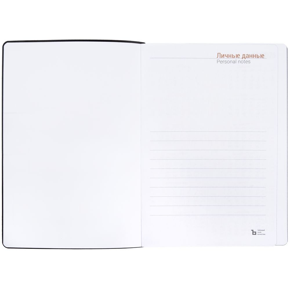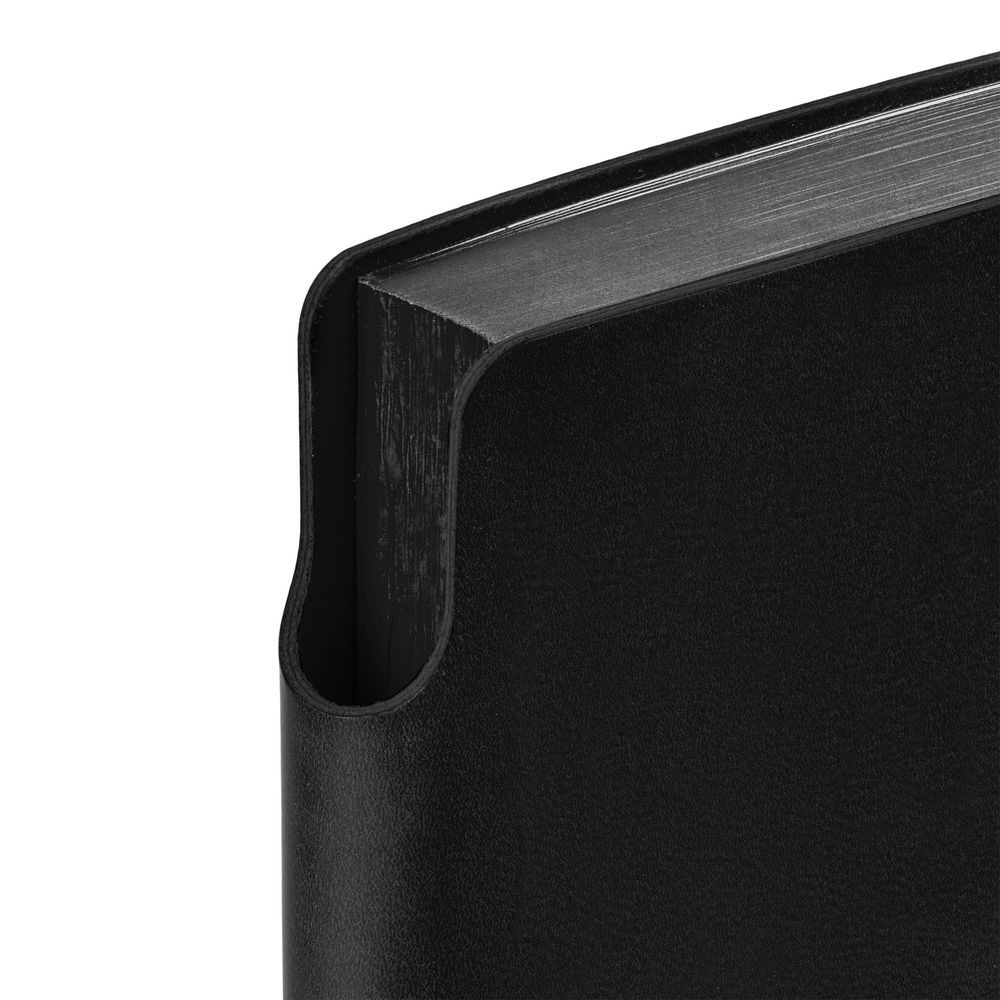 Гибкая обложка ежедневника выполнена из материала Latte, черный АА. Внутри корешка — специальное место для крепления ручки размером до 15х0,9 см.