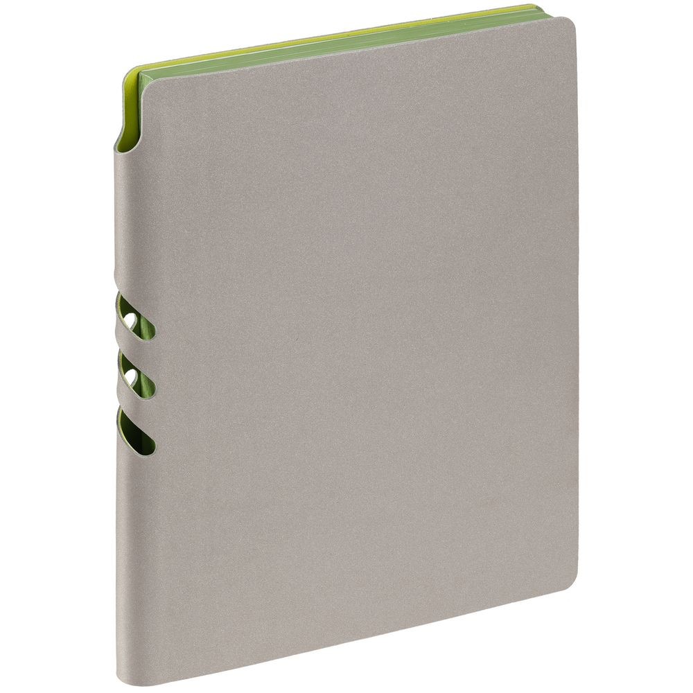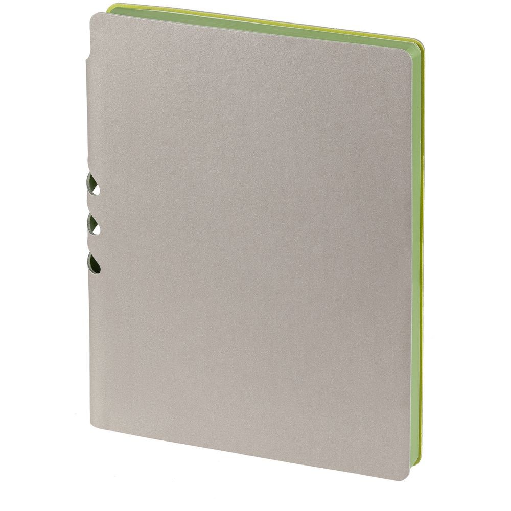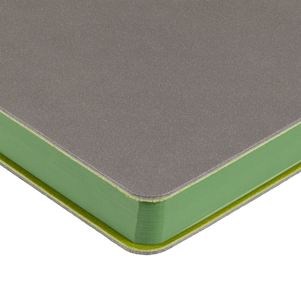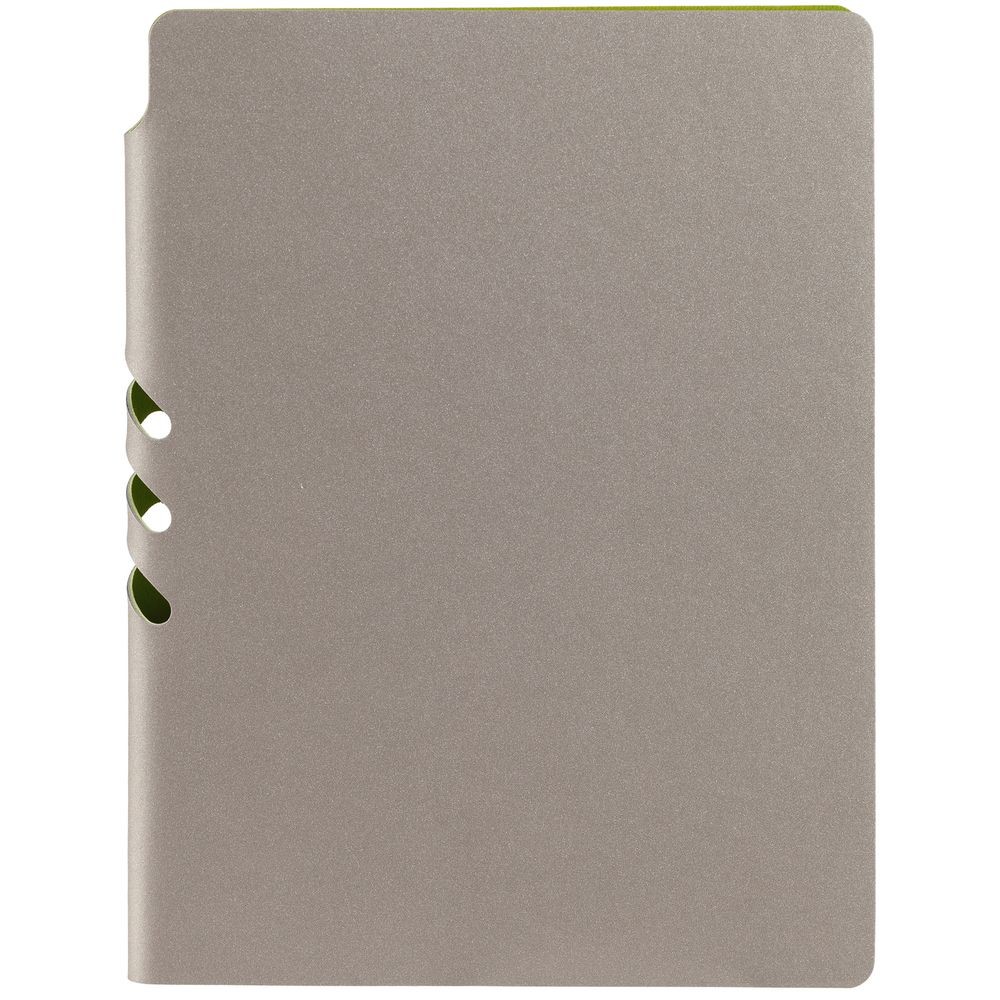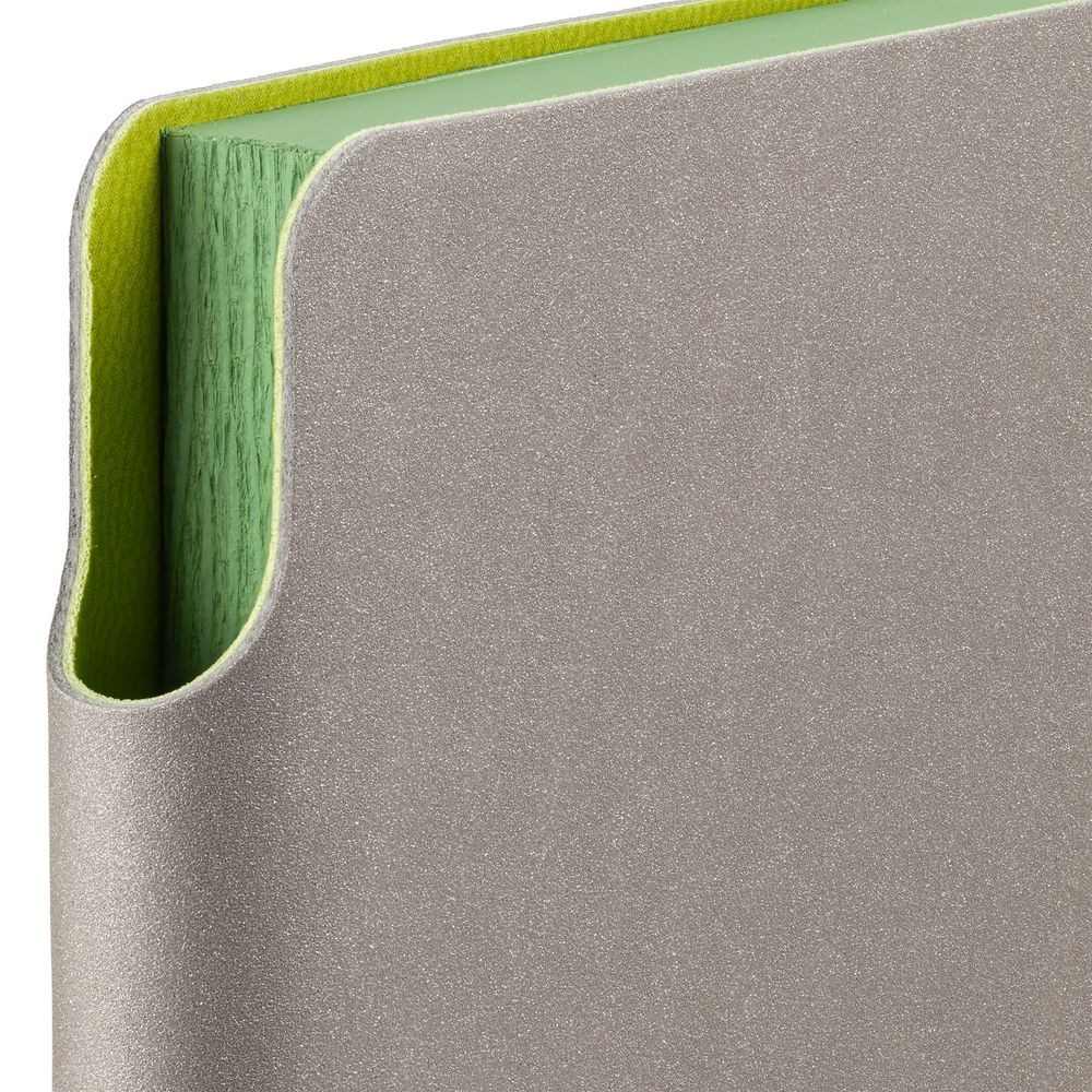 Гибкая обложка выполнена из материала Velour Melange, серый СС и Latte, светло-зеленый (внутренняя часть обложки). Внутри корешка — специальное место для крепления ручки размером до 15х0,9 см.