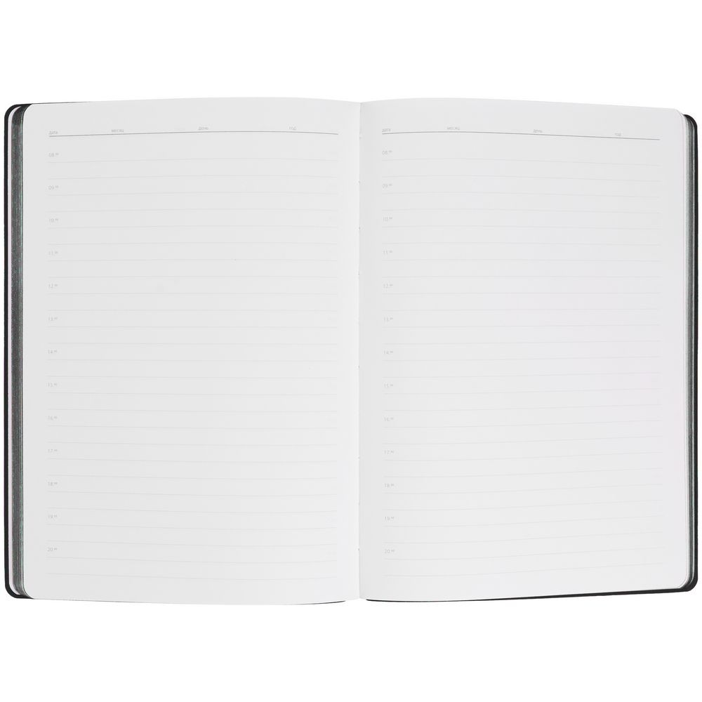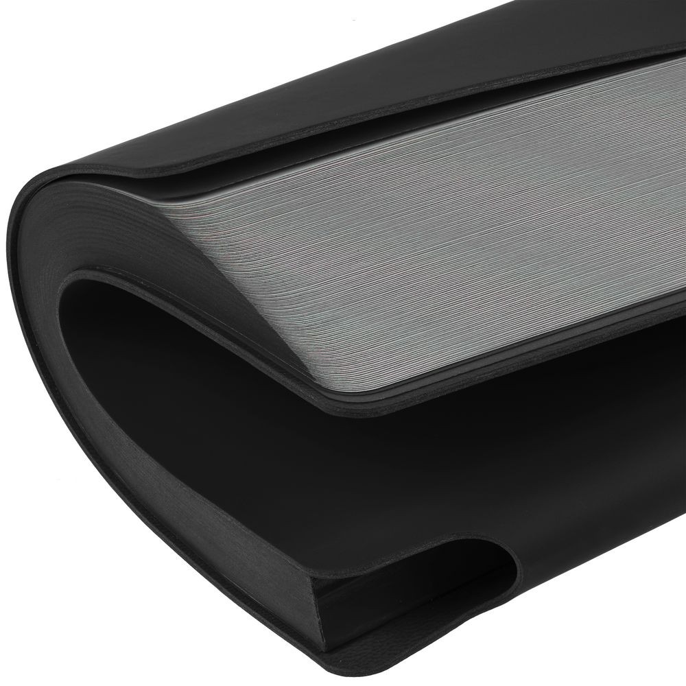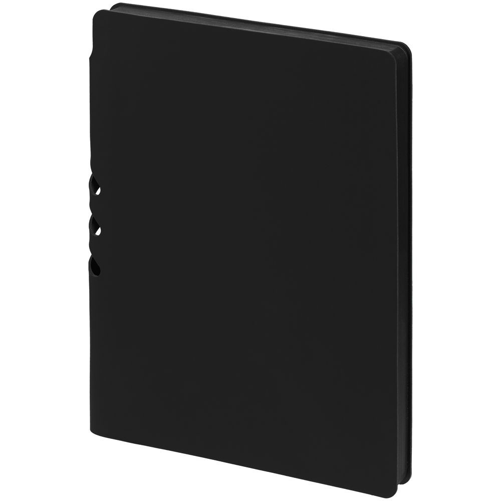Гибкая обложка выполнена из материала Soft Touch, черный АА и Latte, черный АА (внутренняя часть обложки). Внутри корешка — специальное место для крепления ручки размером до 15х1 см.
