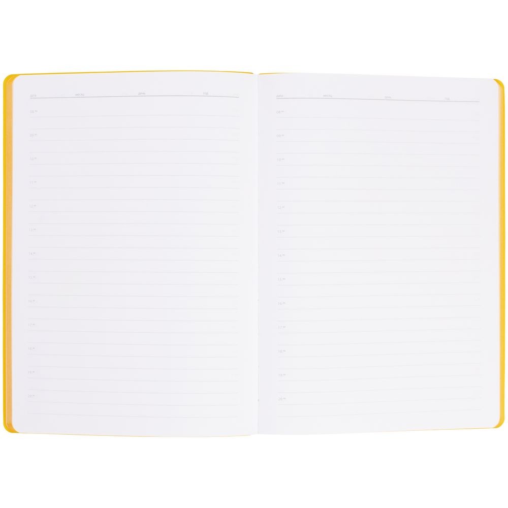Гибкая обложка выполнена из материала Soft Touch, желтый КК и Latte, желтый КК (внутренняя часть обложки). Внутри корешка — специальное место для крепления ручки размером до 15х1 см.