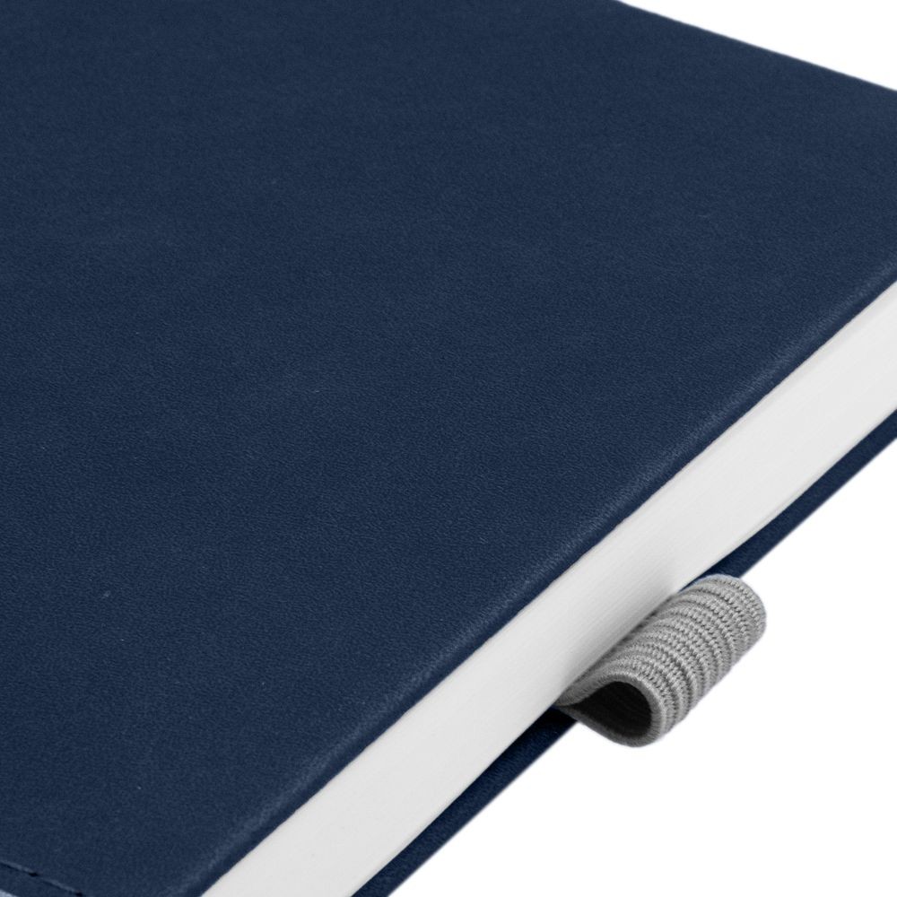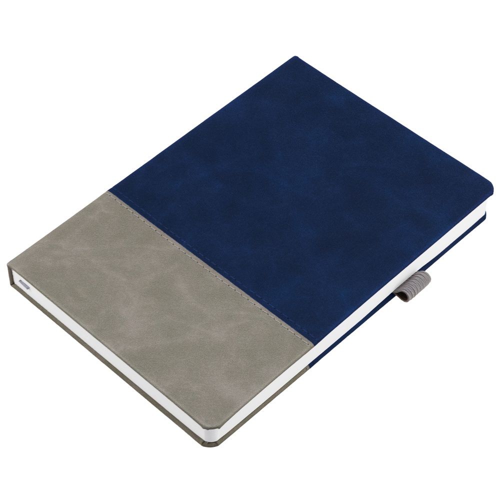 Ежедневник с твердой обложкой, без поролона, со сшивкой материалов Nubuck Touch, серый СС, и Nubuck Touch, темно-синий ХХ, дополнен двойным ляссе и петлей-резинкой для ручки.