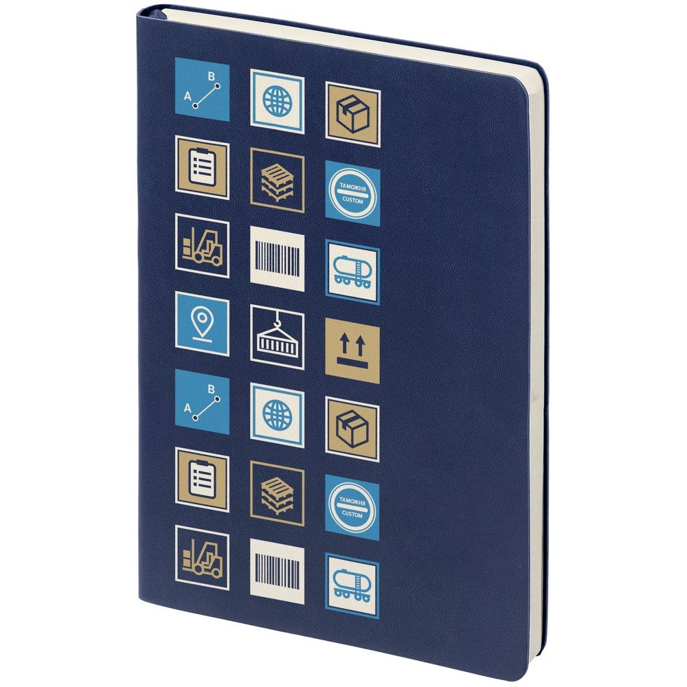 Расчет нанесенияЕжедневник с гибкой обложкой, выполнен из материала Latte, темно-синий, дополнен ляссе в цвет обложки.