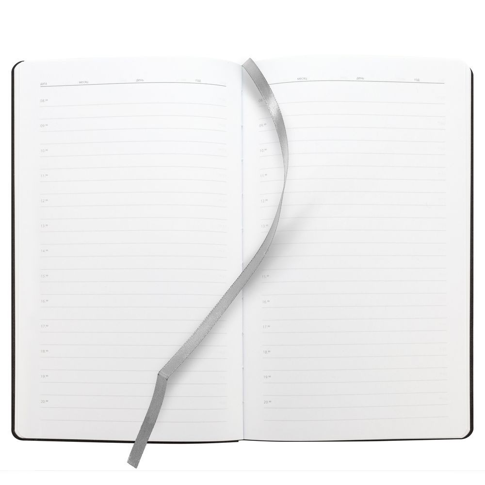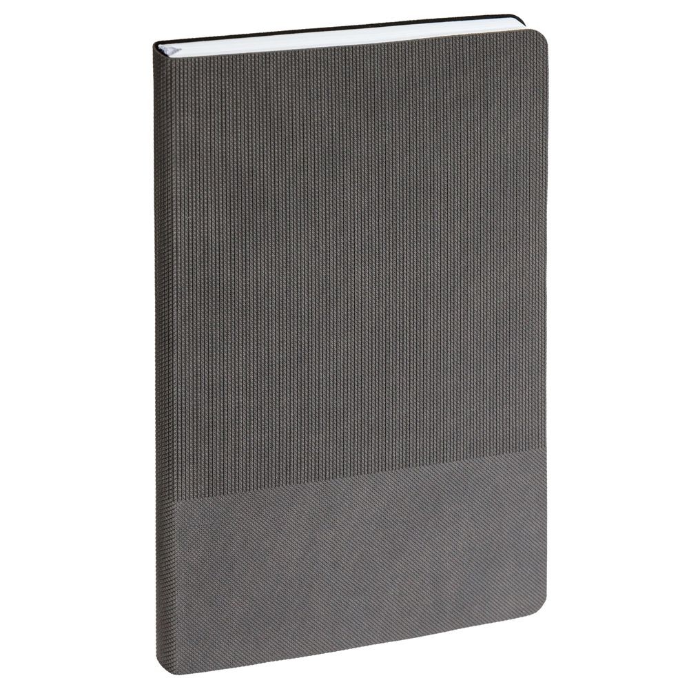 Ежедневник с гибкой обложкой, выполнен из материала Canyon, темно-серый ЕЕ, дополнен ляссе в цвет обложки. Блинтовое тиснение на обложке создает эффект вязаного полотна.