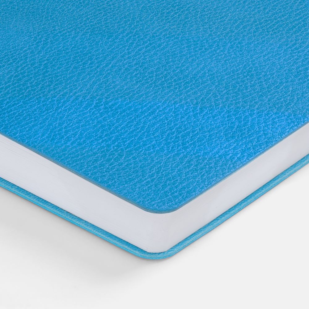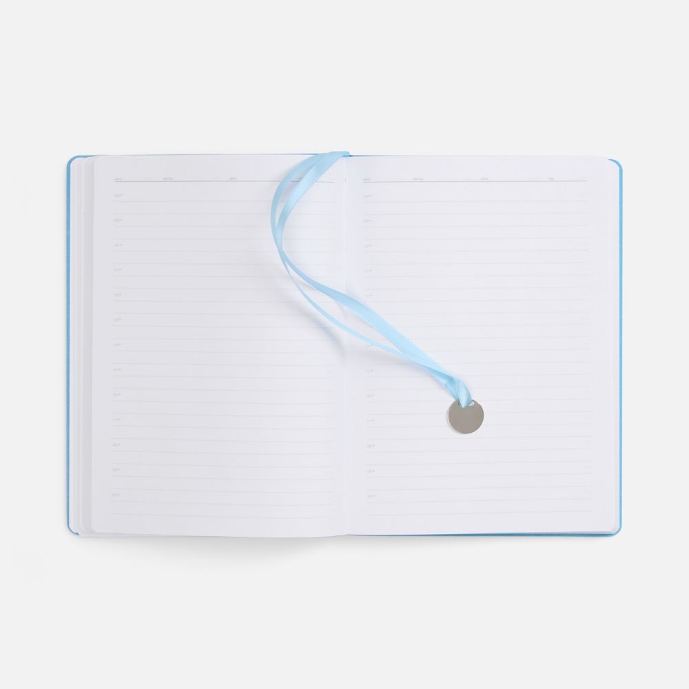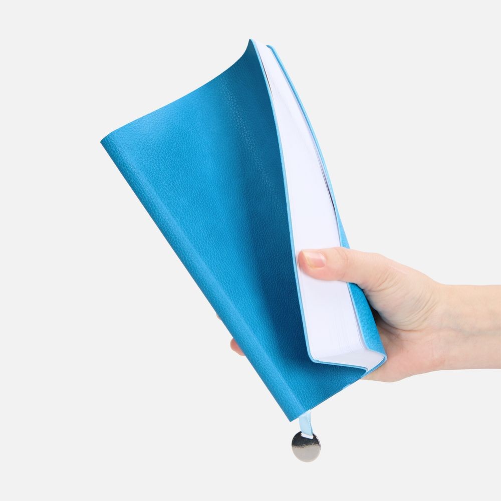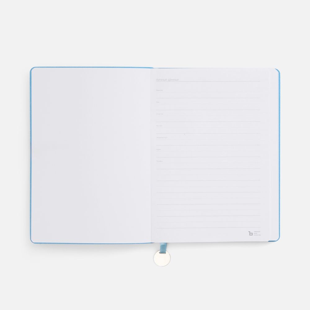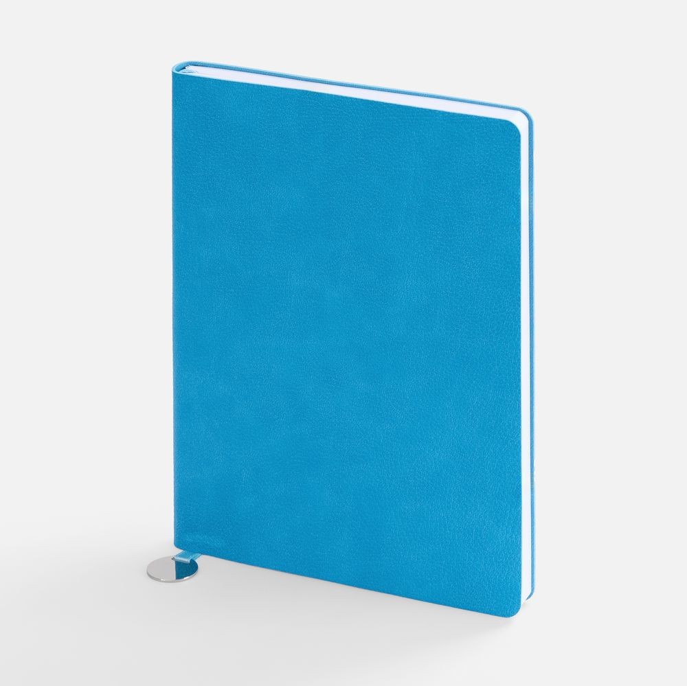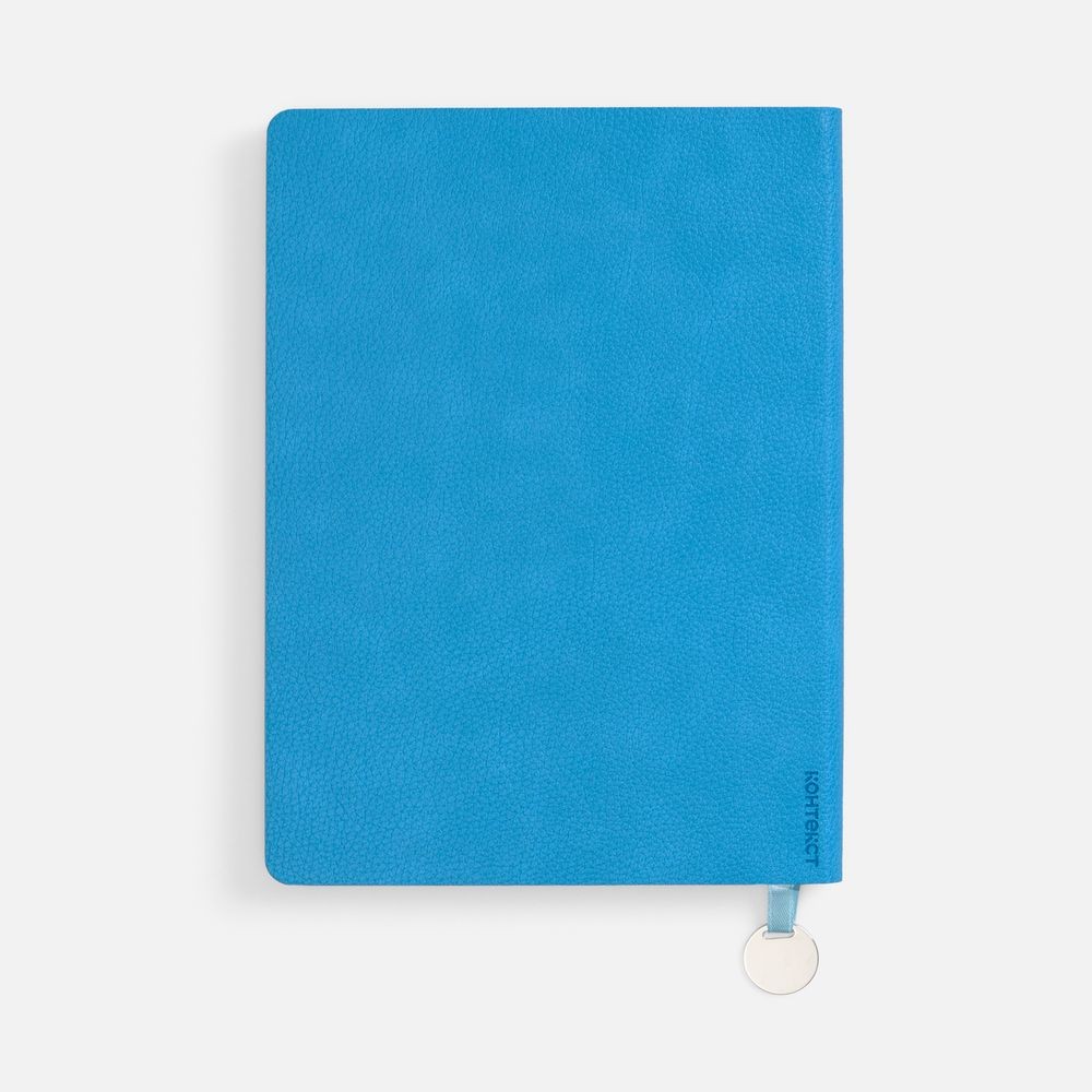Ежедневник с гибкой обложкой, выполнен из материал La Fite, голубой JJ, дополнен ляссе в цвет обложки с металлическим шильдом.
