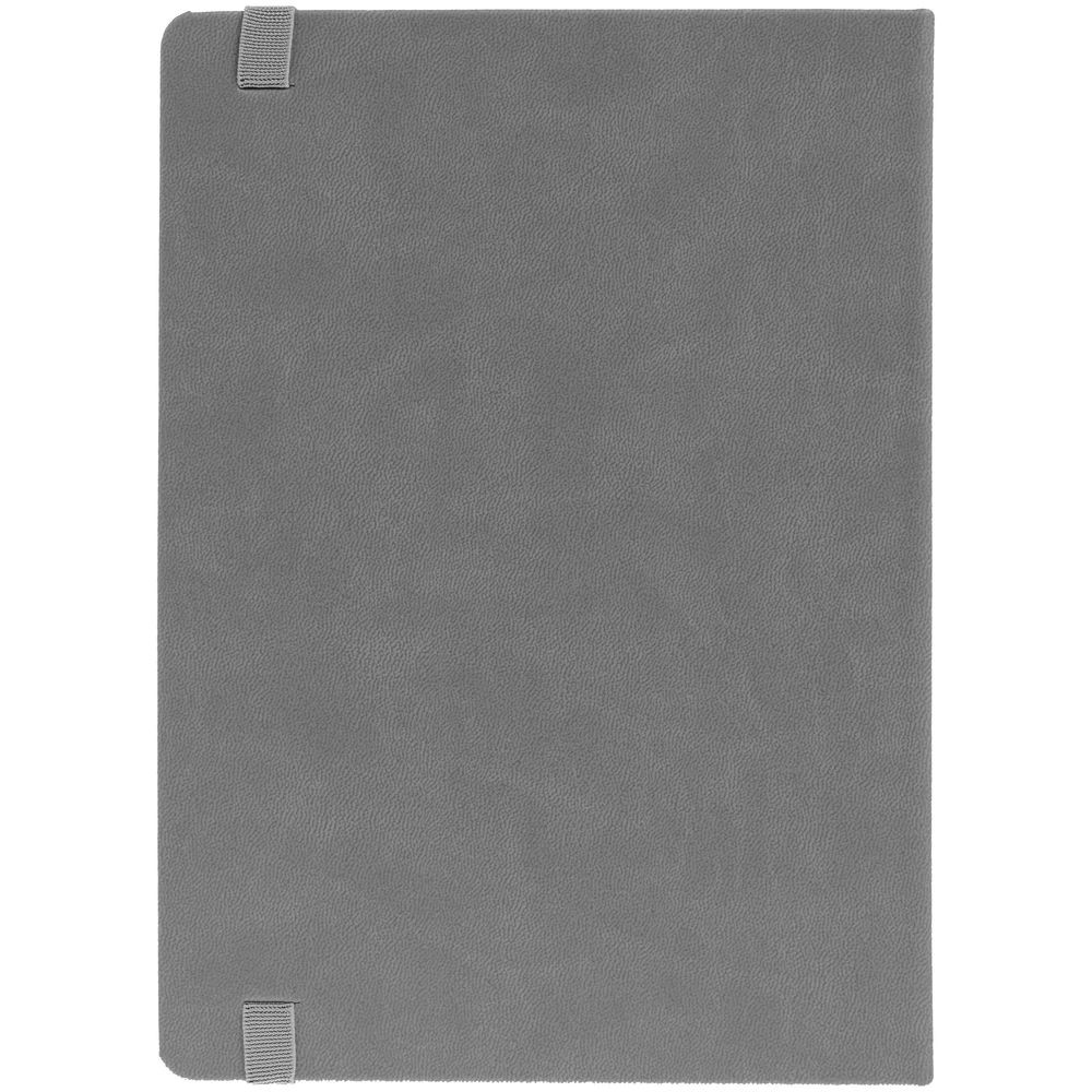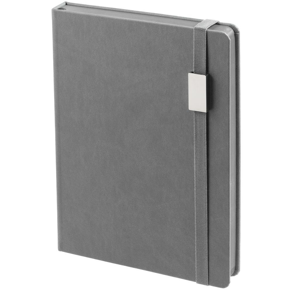 Ежедневник с твердой обложкой, выполнен из материала Latte, серый СС, обрез серого цвета, дополнен ляссе серого цвета и резинкой с металлическим шильдом.