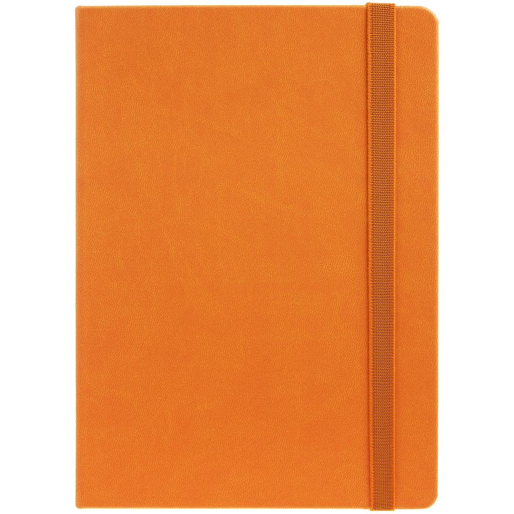 Ежедневник с твердой обложкой, выполнен из материала Latte, оранжевый ОО, обрез оранжевого цвета, дополнен резинкой и ляссе оранжевого цвета.