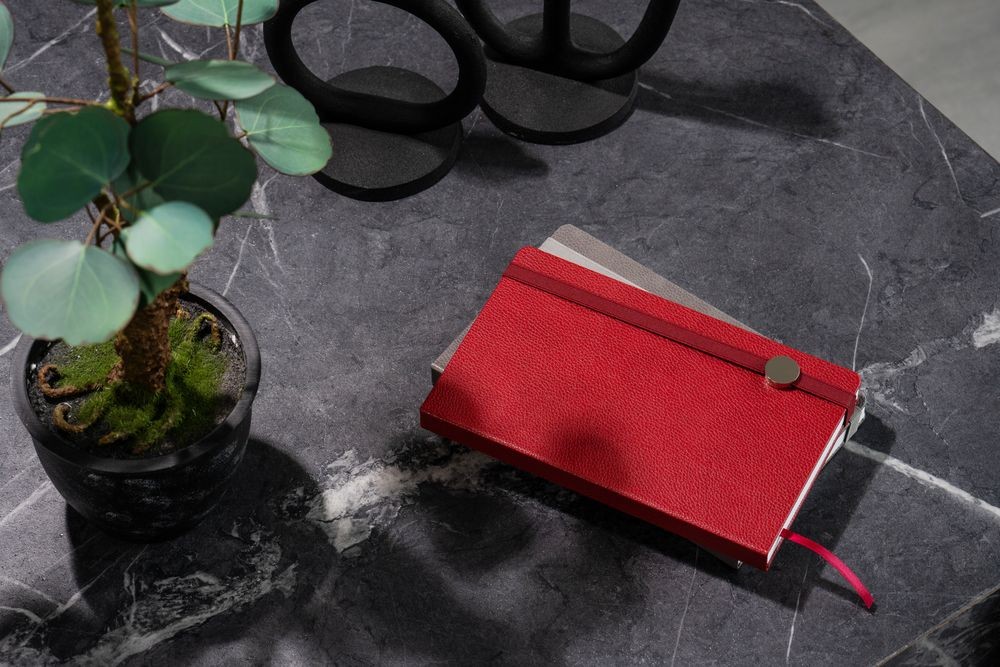 Ежедневник с твердой обложкой, выполнен из материала LaFite, серый СС, дополнен резинкой с металлическим круглым шильдом и ляссе в цвет обложки.