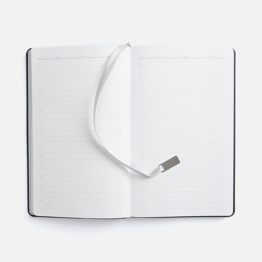 Ежедневник с гибкой обложкой, выполнен из материала Petrus, серый СС, дополнен серым ляссе с металлическим шильдиком.