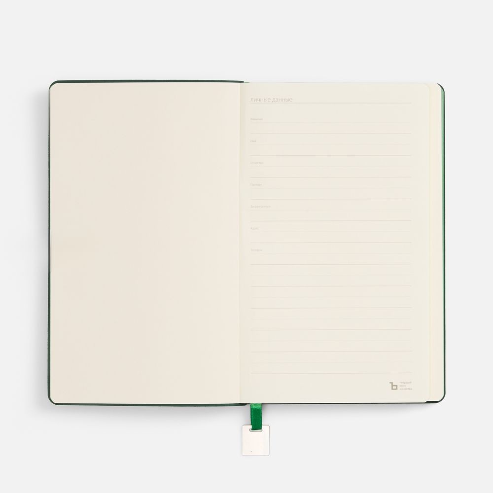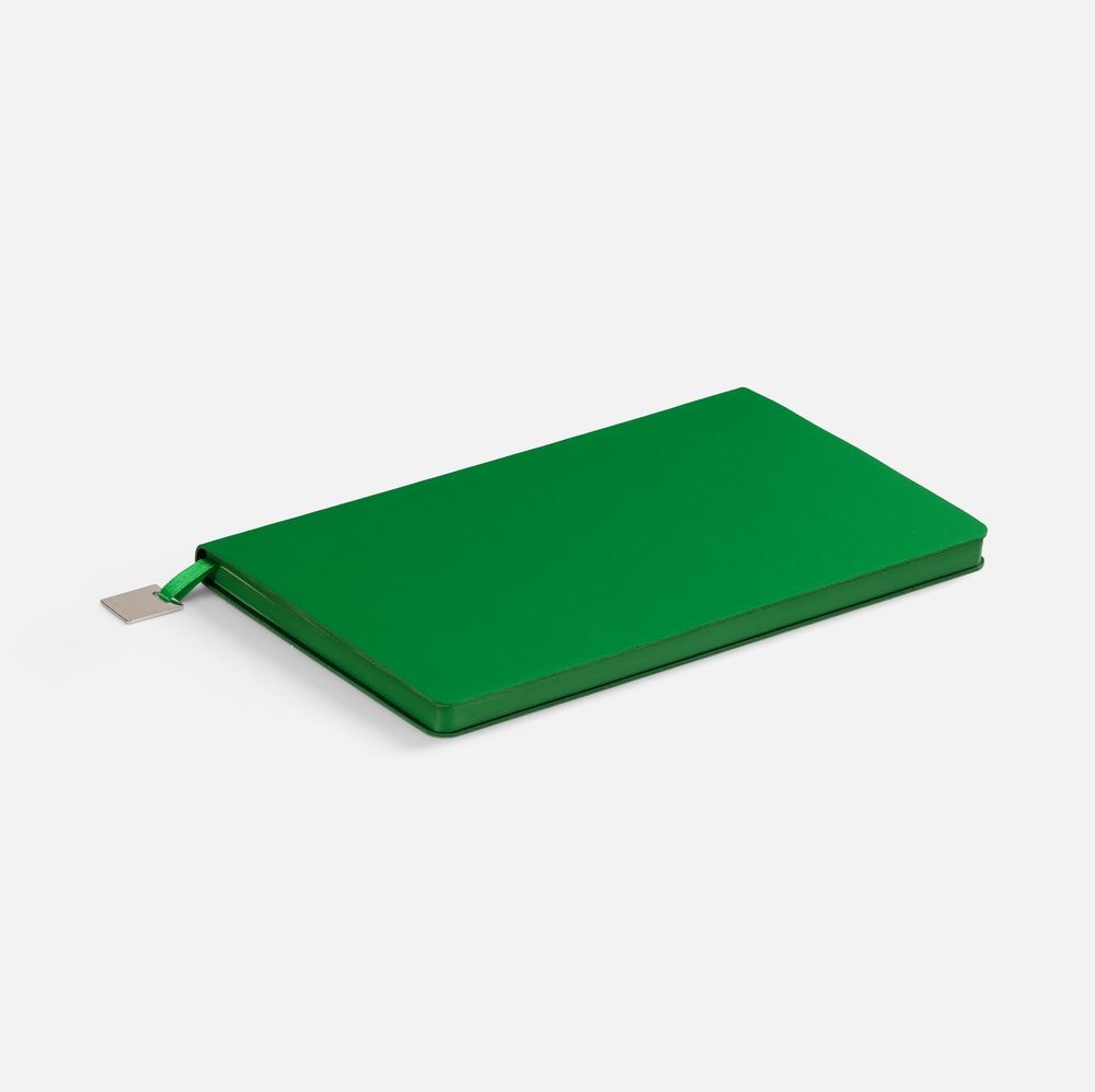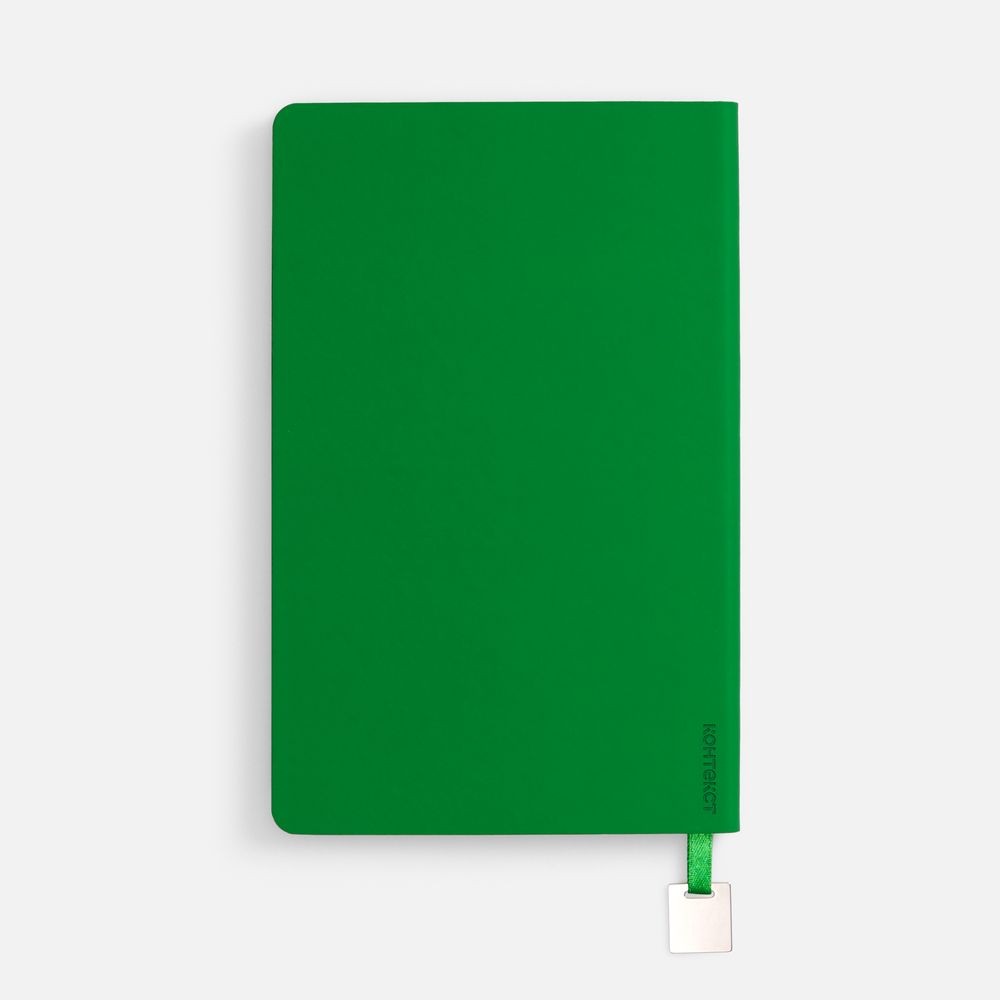 Ежедневник с гибкой обложкой, выполнен из материалов Soft Touch Ultra, зеленый FF, и Latte, зеленй (внутренняя часть обложки), дополнен ляссе в цвет обложки с металлическим шильдиком.