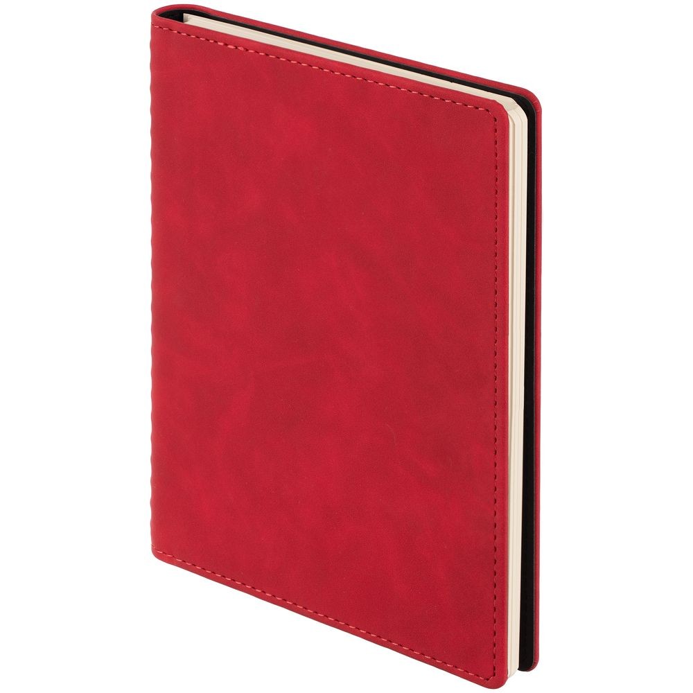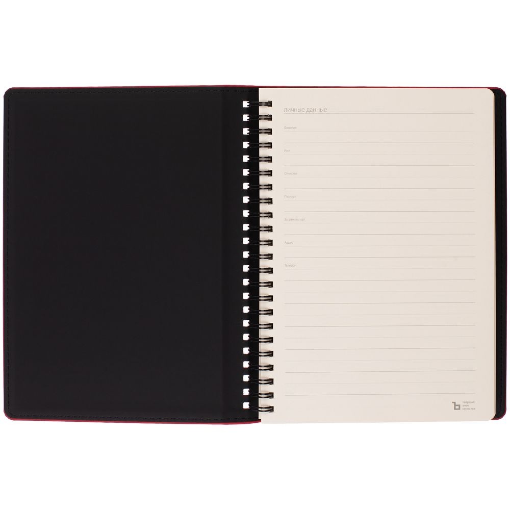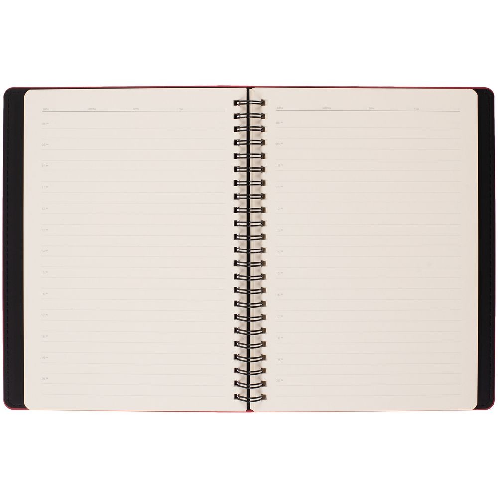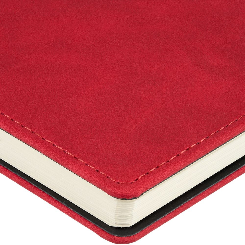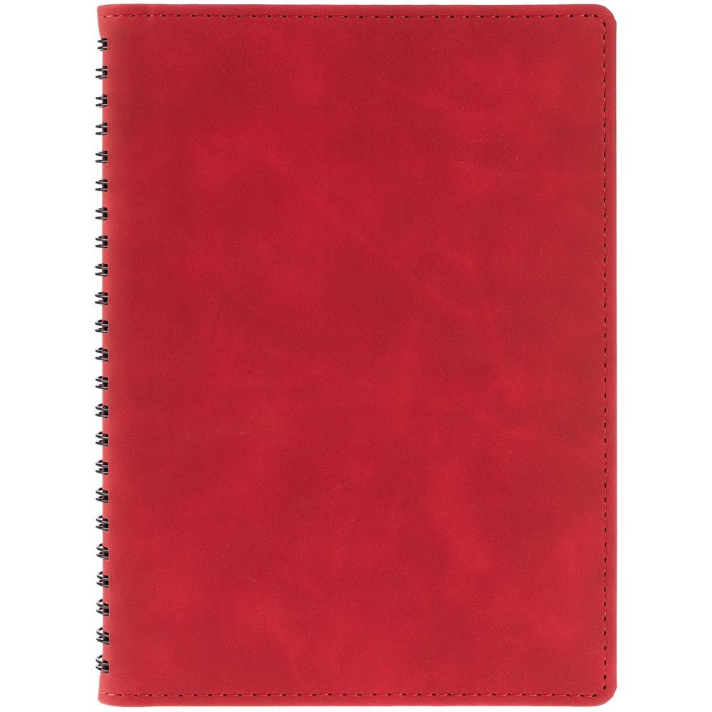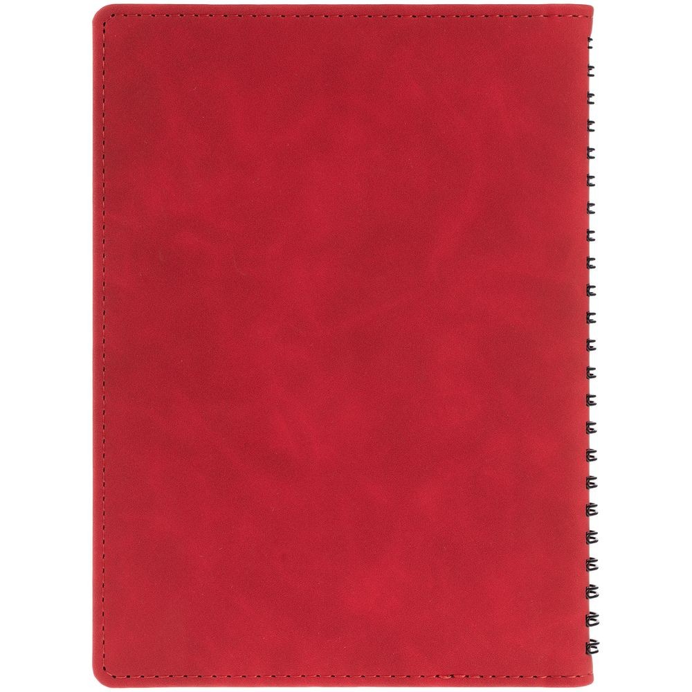 Ежедневник с блоком на пружине в твердой обложке, выполнен из материалов Nubuk Touch, красный PP и Soft Touch, черный AA.