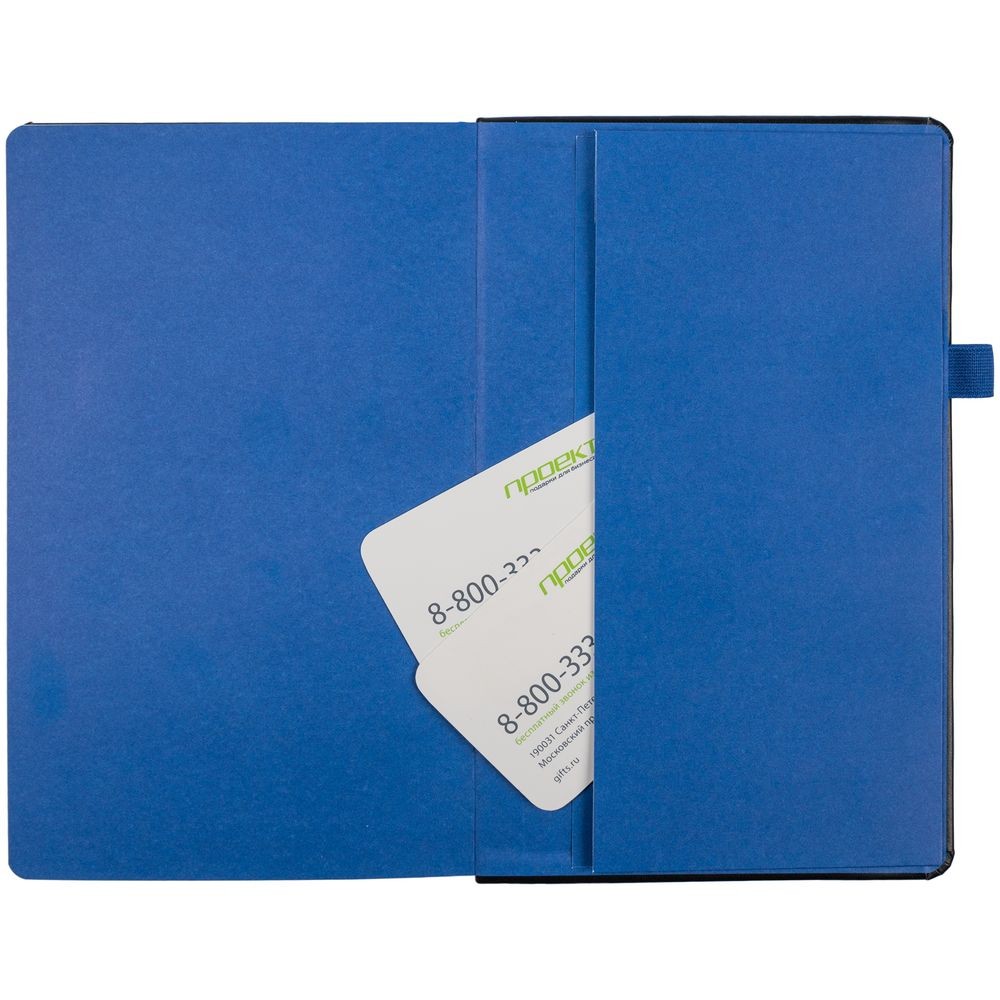 Ежедневник с твердой обложкой, выполнен из материала Waltz, черный АА, дополнен синей резинкой с металлическим шильдом и ляссе.