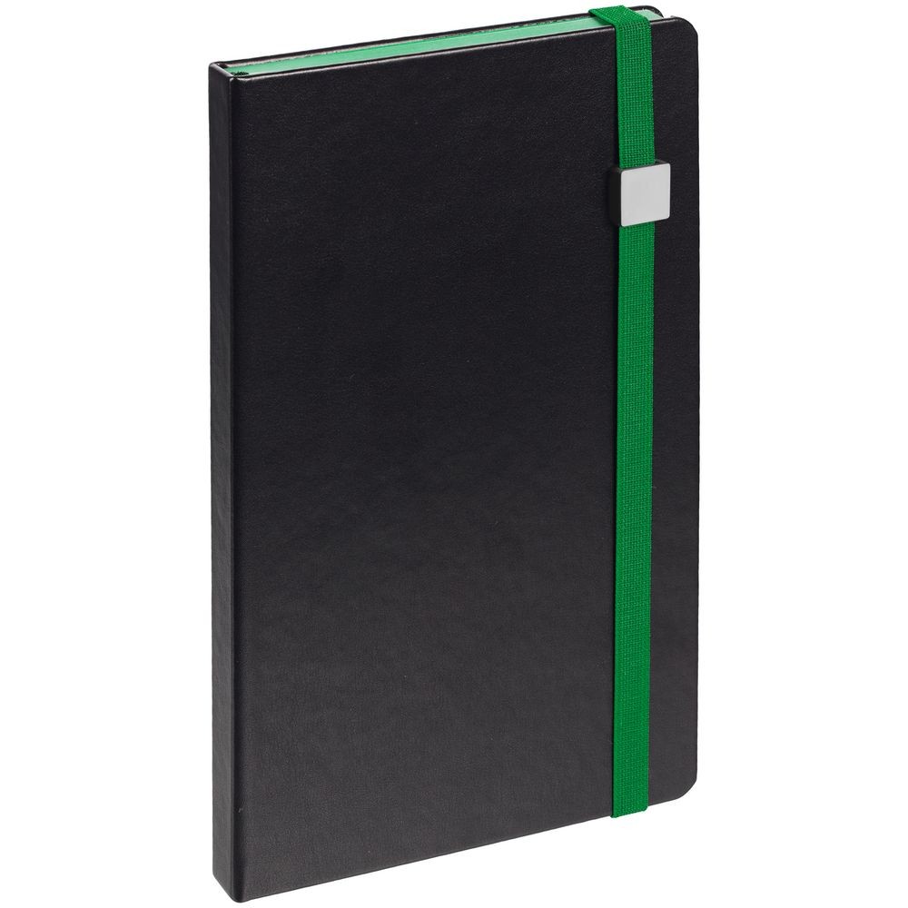 Ежедневник с полутвердой обложкой, выполнен из материала Waltz, черный АА, дополнен зеленой резинкой с металлическим шильдом и ляссе.