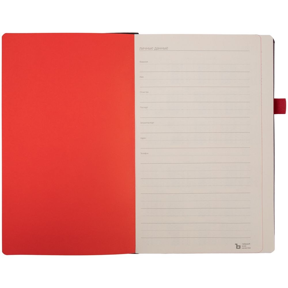 Ежедневник с твердой обложкой, выполнен из материала Waltz, черный АА, дополнен красными резинкой и ляссе.