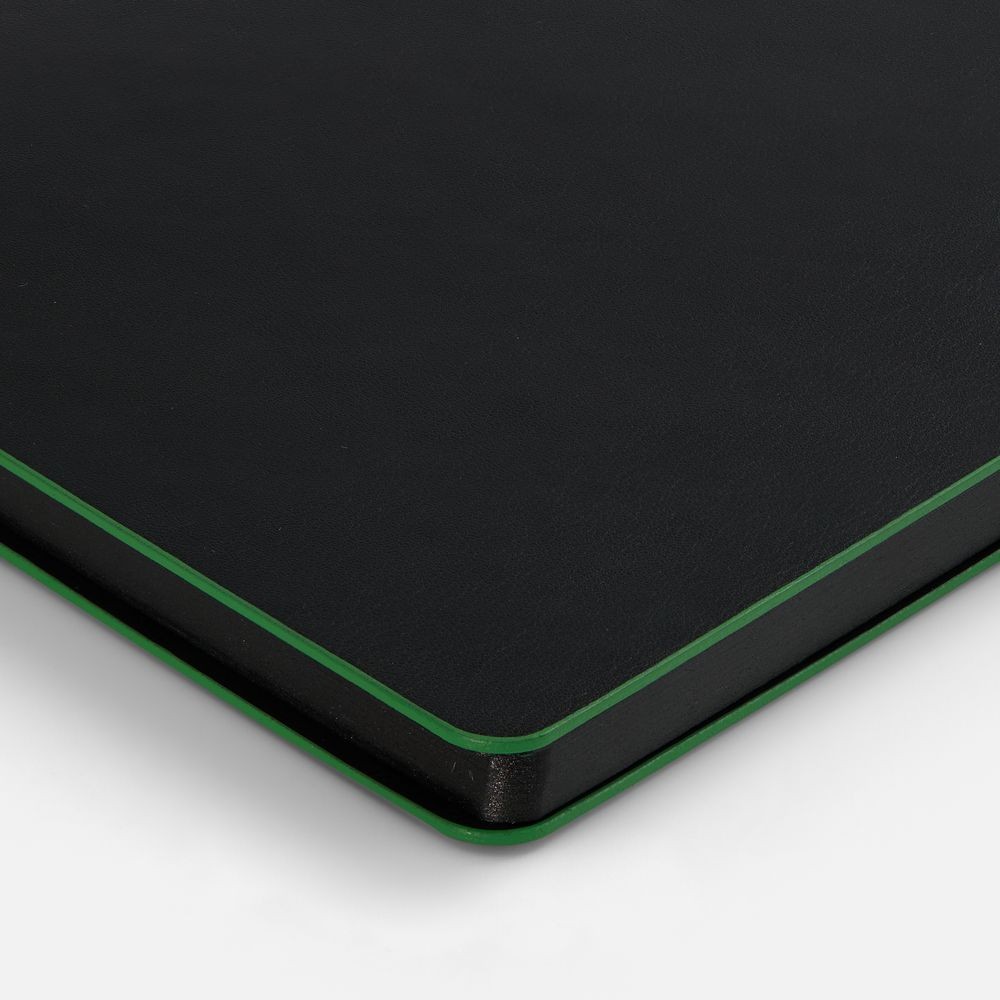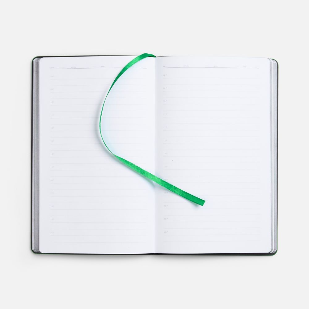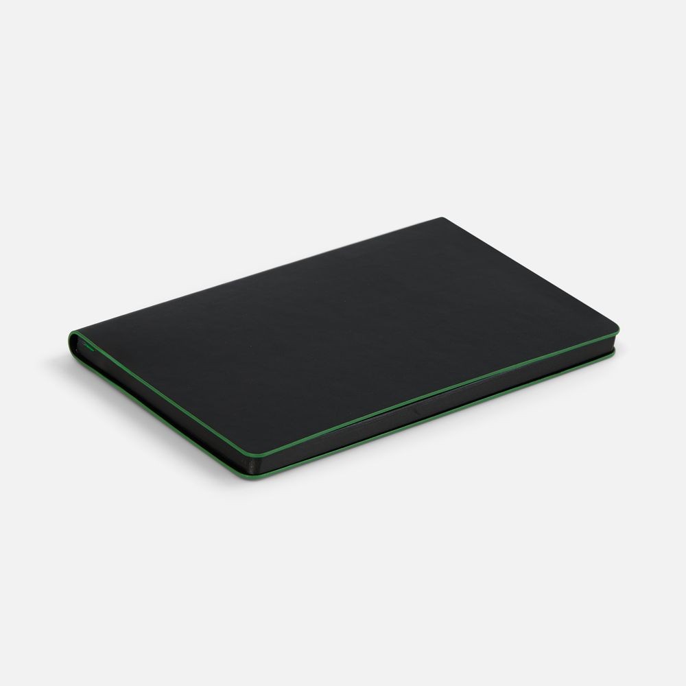 Ежедневник с гибкой обложкой, выполнен из материала Waltz, черный АА, дополнен цветными срезом обложки и ляссе.