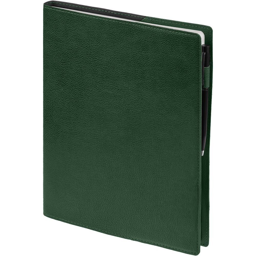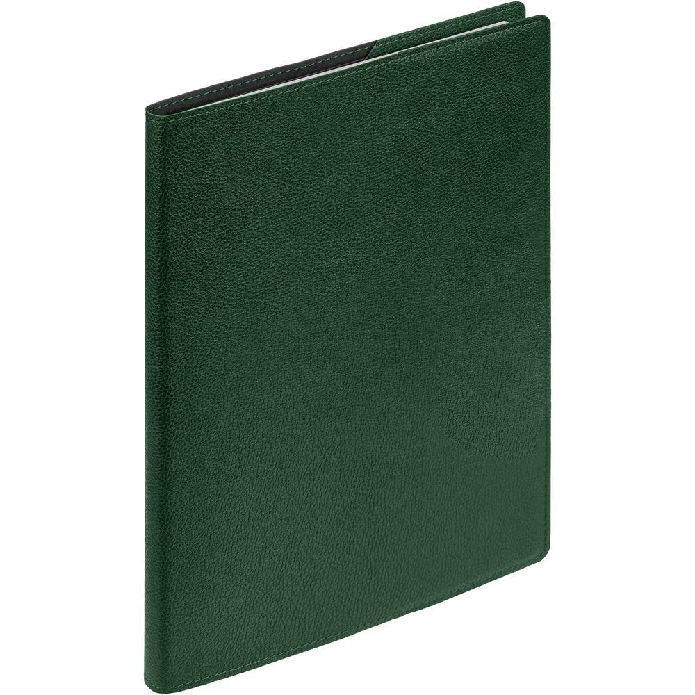 Ежедневник в суперобложке выполнен из материала La Fite, зеленый FF, дополнен ляссе и капталом черного цвета.