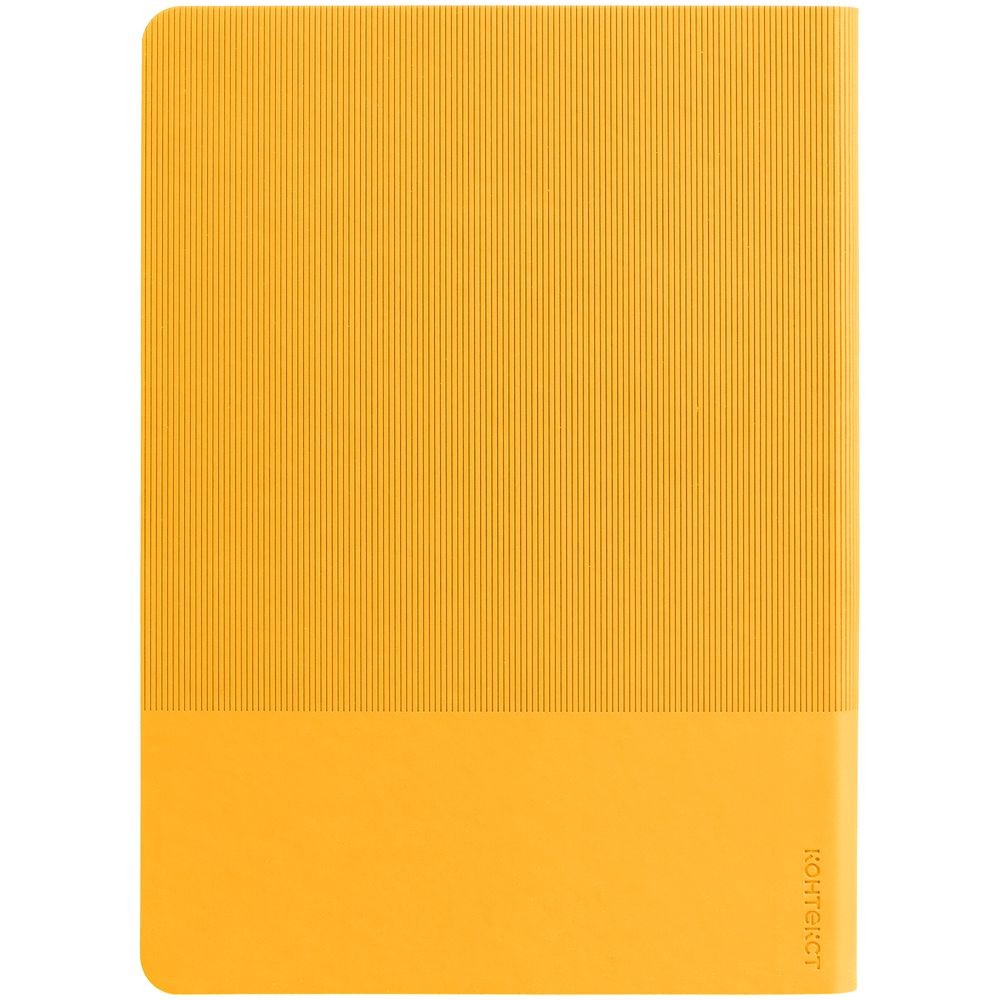 Ежедневник с гибкой обложкой выполнен из материала Soft Touch, желтый KK и Latte, желтый (внутренний материал); дополнен ляссе желтого цвета и фактурным тиснением обложки.