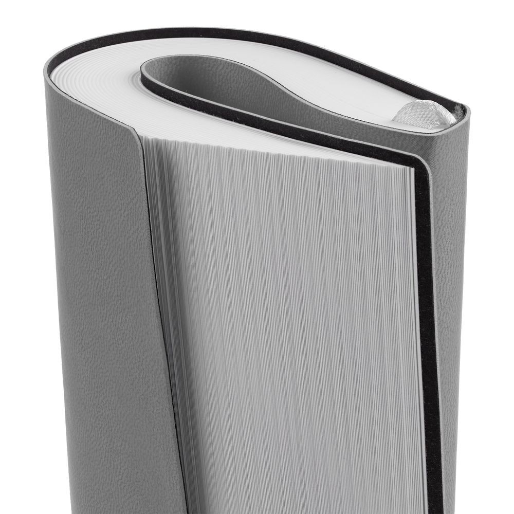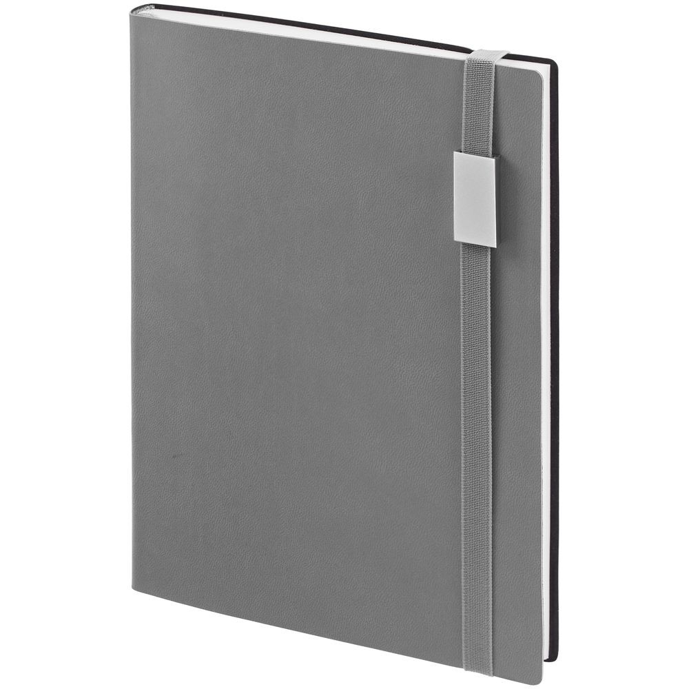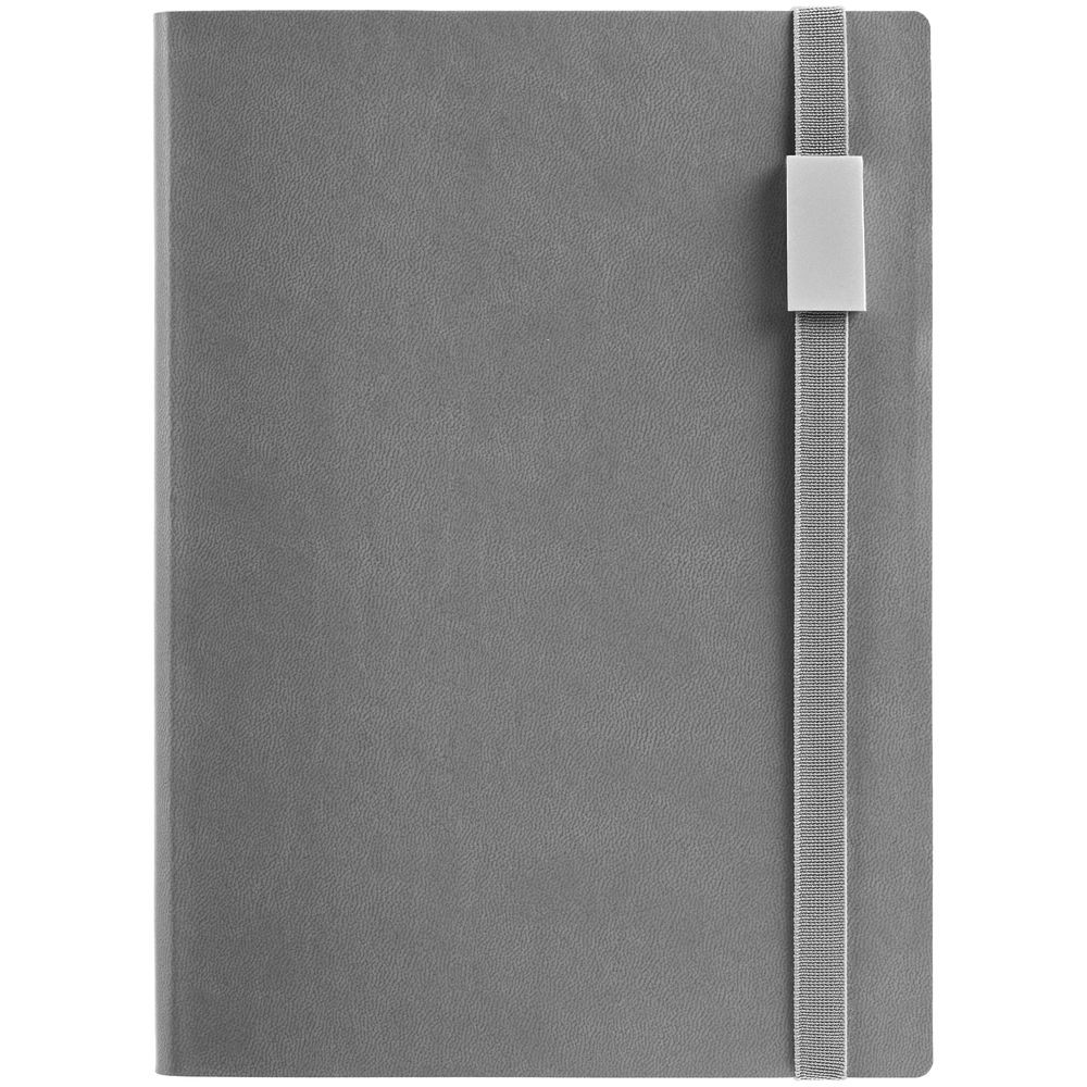 Ежедневник с гибкой обложкой, выполнен из материала Latte, серый CC, дополнен резинкой шириной 1 см с металлическим шильдом, капталом и ляссе серого цвета.