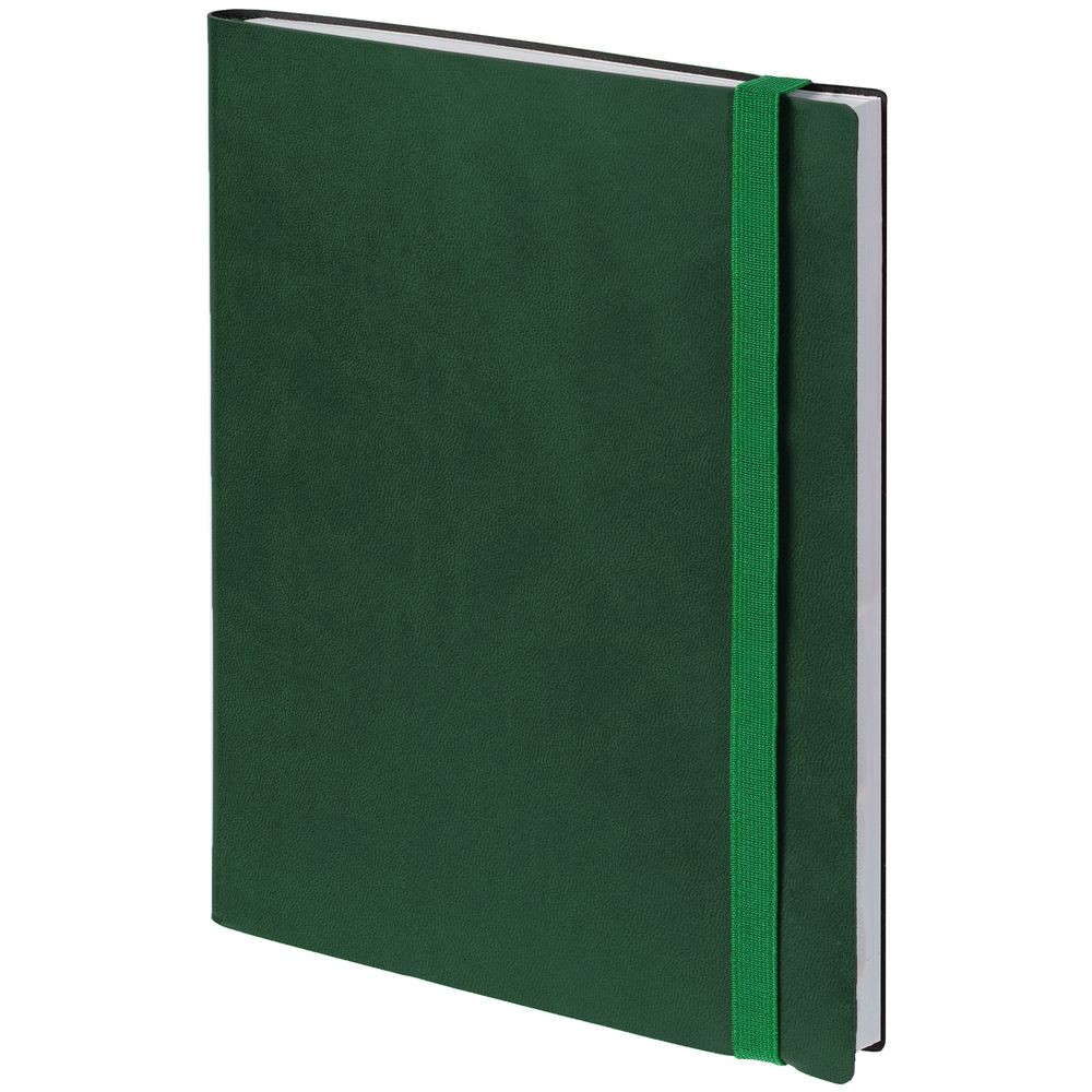 Ежедневник с гибкой обложкой выполнен из материала Latte, зеленый FF, и дополнен резинкой шириной 1 см, капталом и ляссе в цвет обложки.